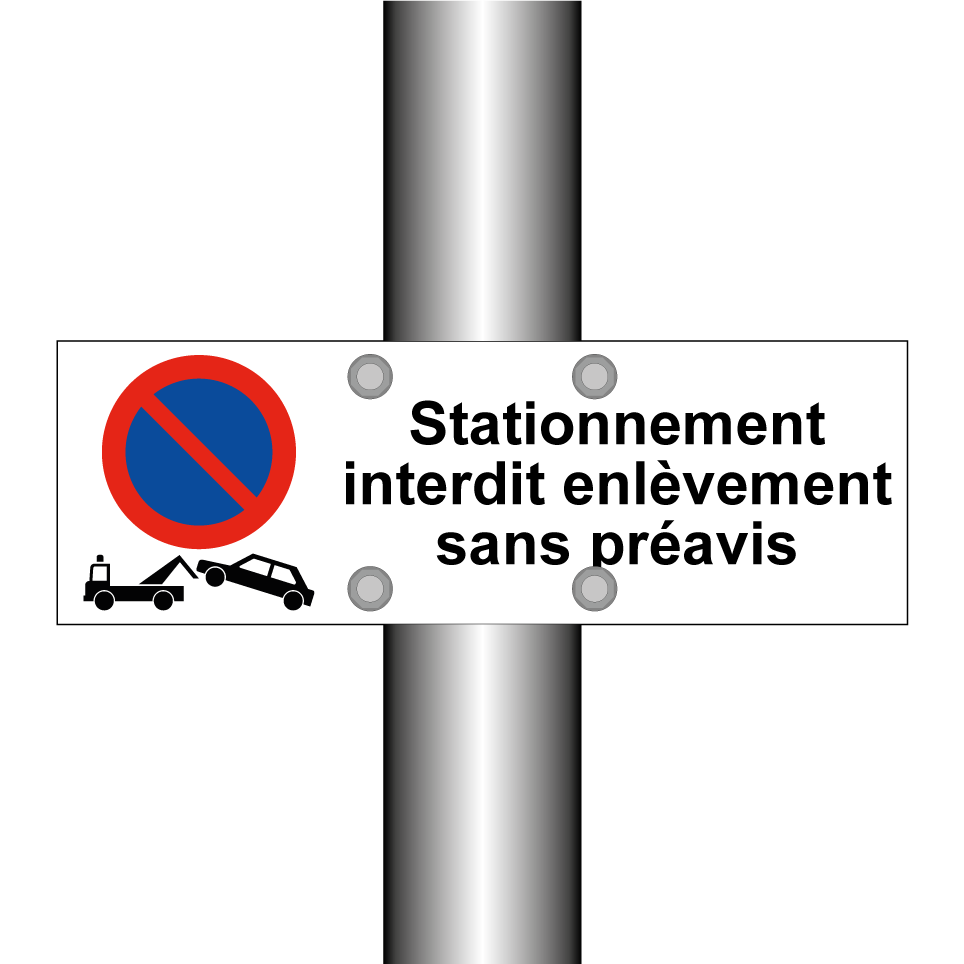 Panneau d'interdiction de stationner avec le texte : "Stationnement interdit enlèvement sans préavis" et une symbolique claire.