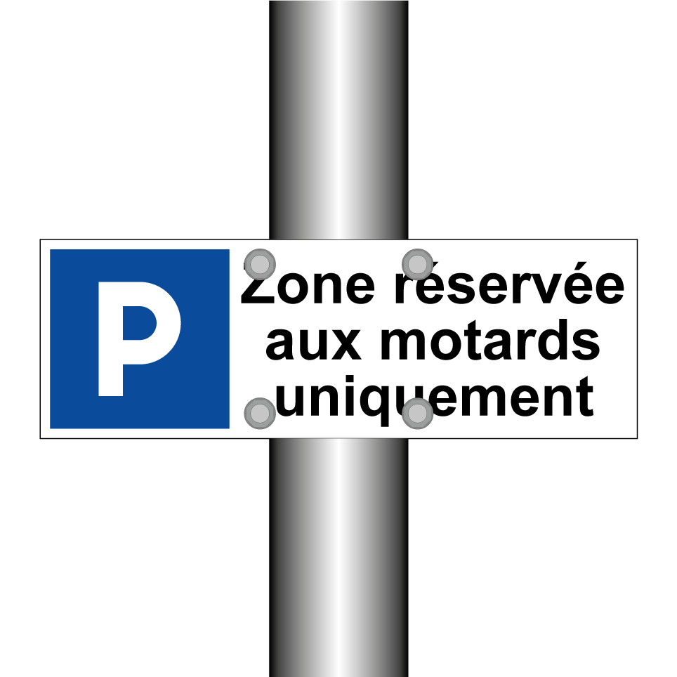 Panneau de stationnement avec le texte : "Zone réservée aux motards uniquement" et une symbolique claire.