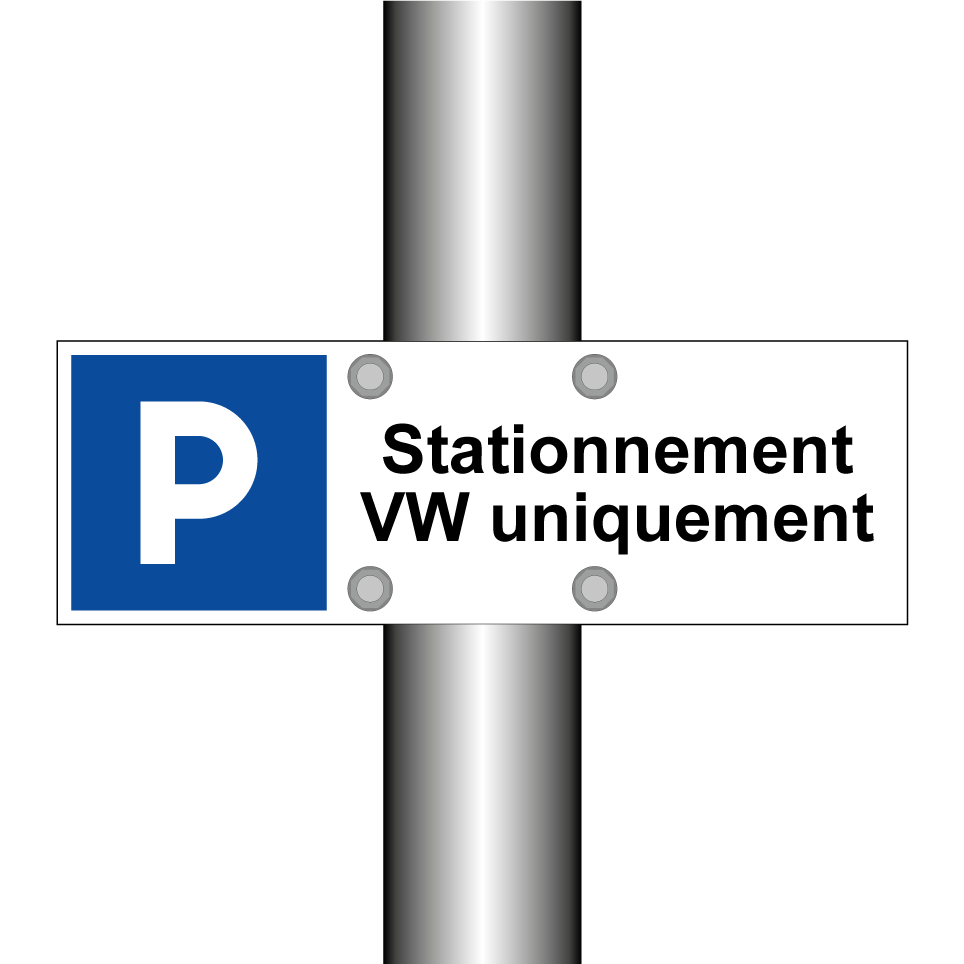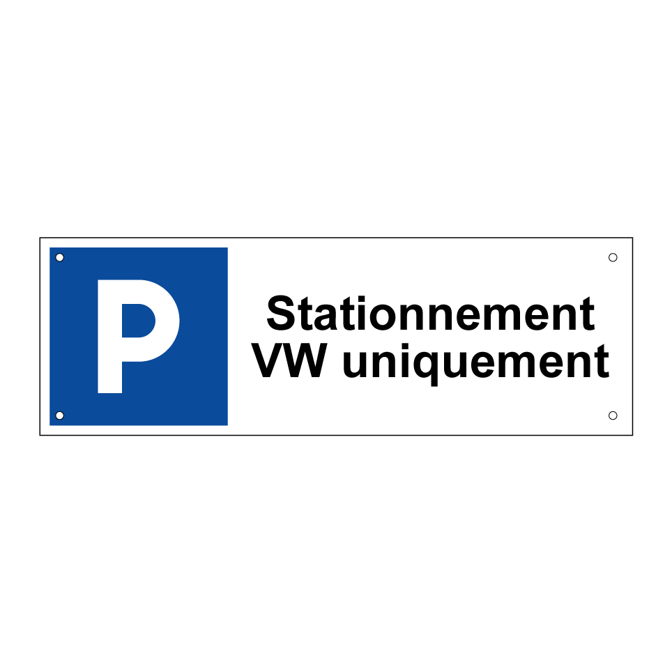 Panneau de stationnement avec le texte : "Stationnement VW uniquement" et une symbolique claire.