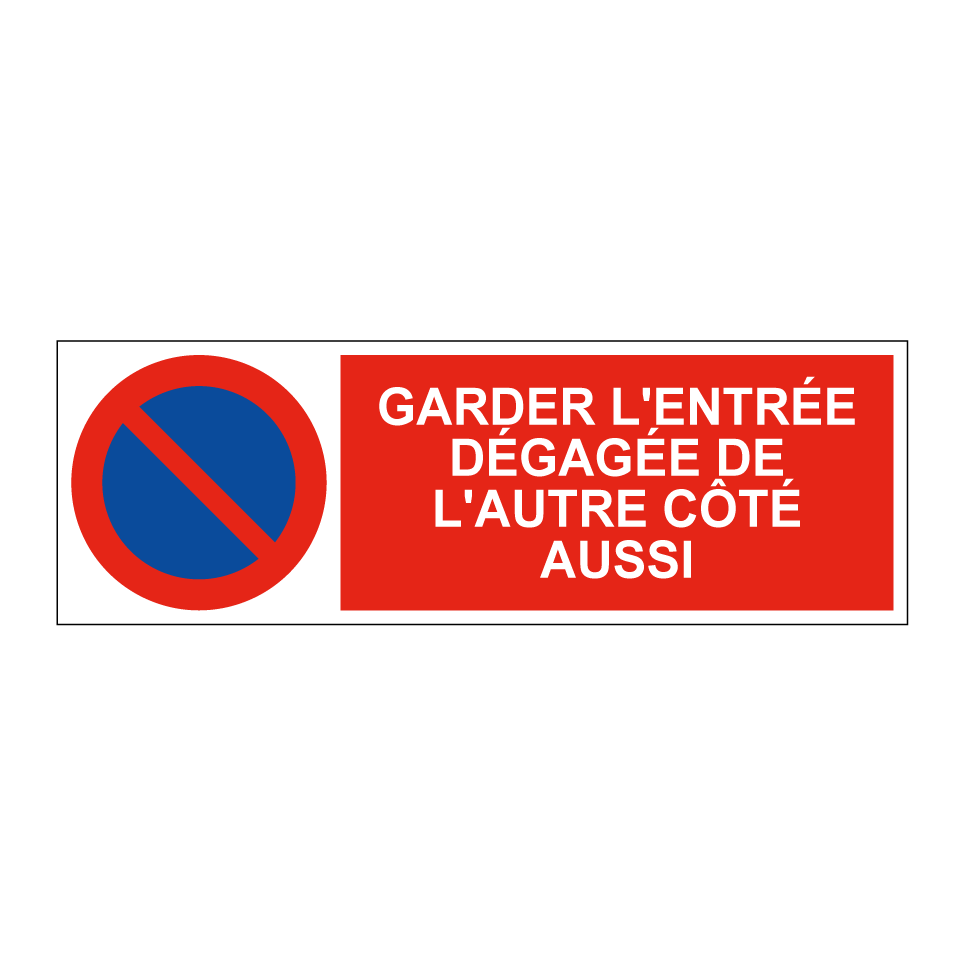 Panneau d'interdiction de stationner avec le texte : "Garder l'entrée dégagée de l'autre côté aussi" et une symbolique claire.