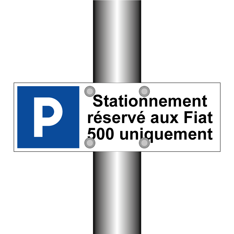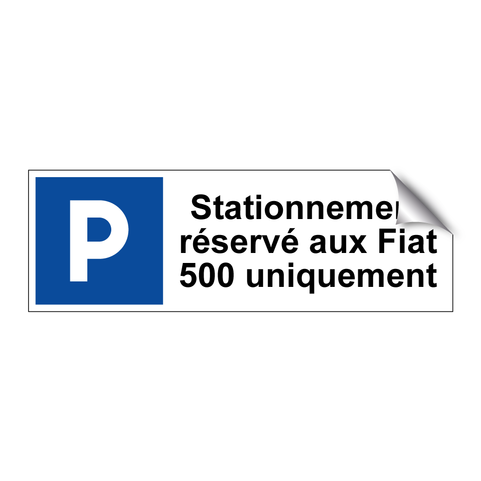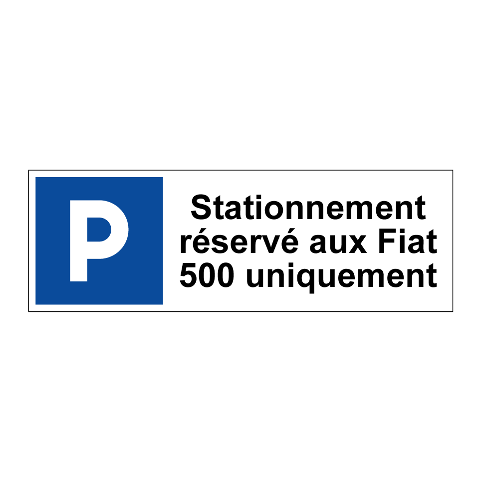 Panneau de stationnement avec le texte : "Stationnement réservé aux Fiat 500 uniquement" et une symbolique claire.
