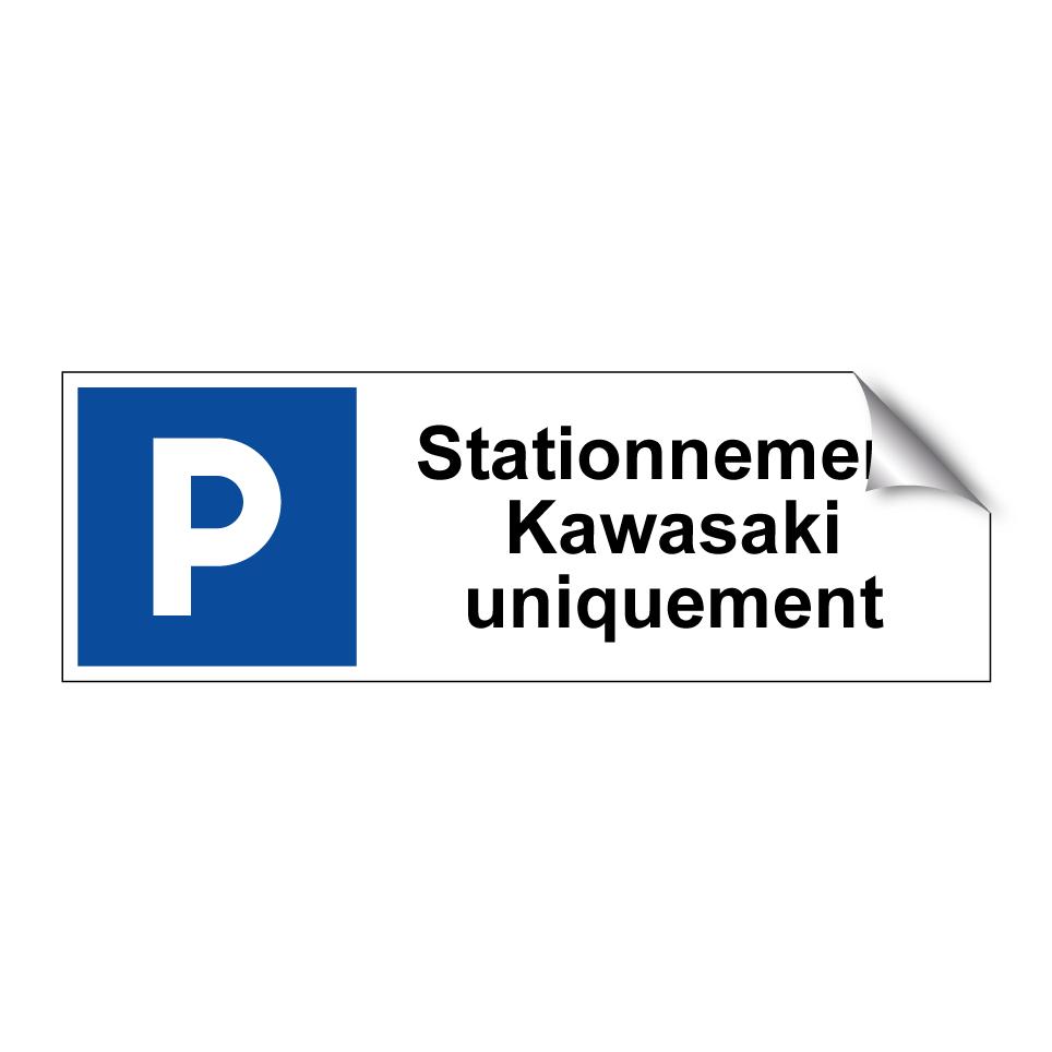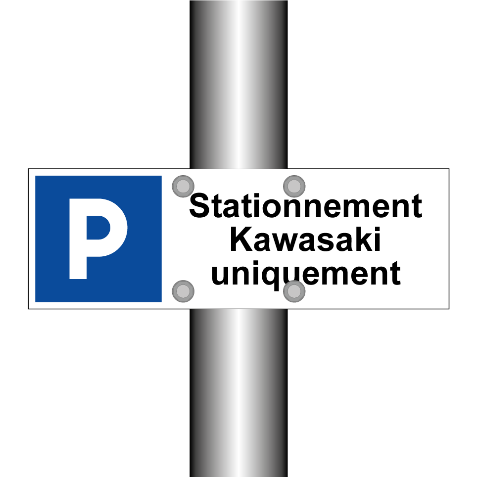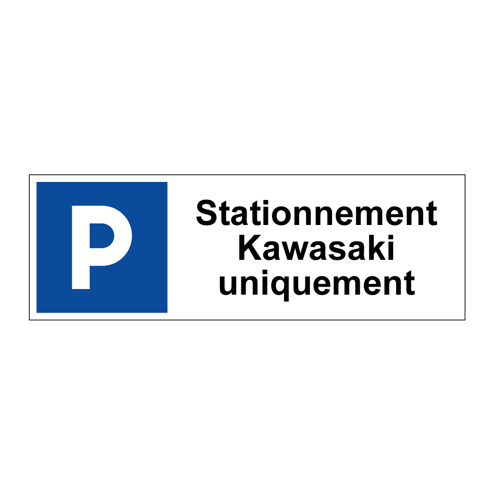 Panneau de stationnement avec le texte : "Stationnement Kawasaki uniquement" et une symbolique claire.