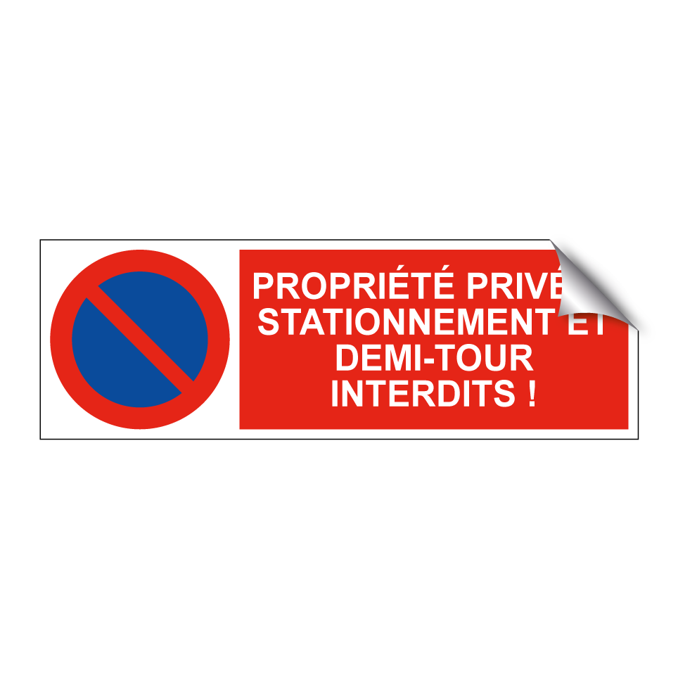 Panneau d'interdiction de stationner avec le texte : "Propriété privée ! Stationnement et demi-tour interdits !" et une symbolique claire.