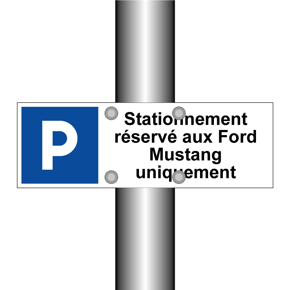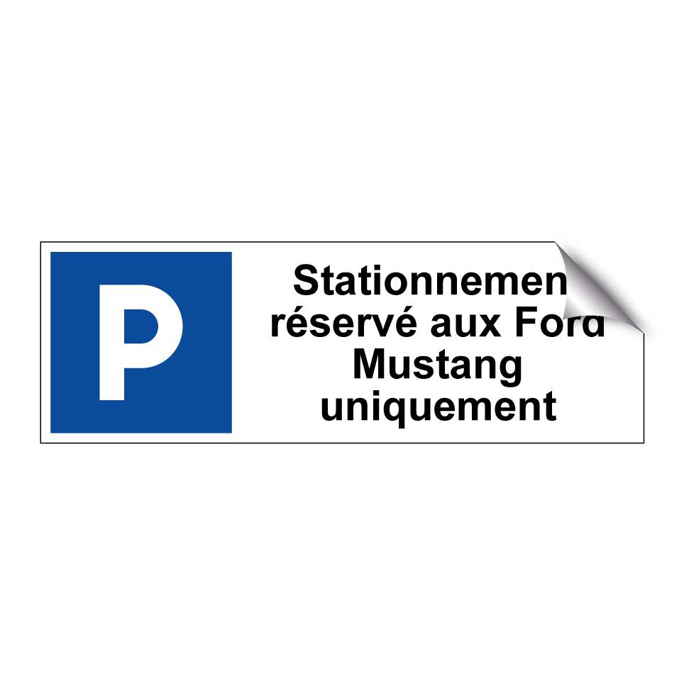 Panneau de stationnement avec le texte : "Stationnement réservé aux Ford Mustang uniquement" et une symbolique claire.