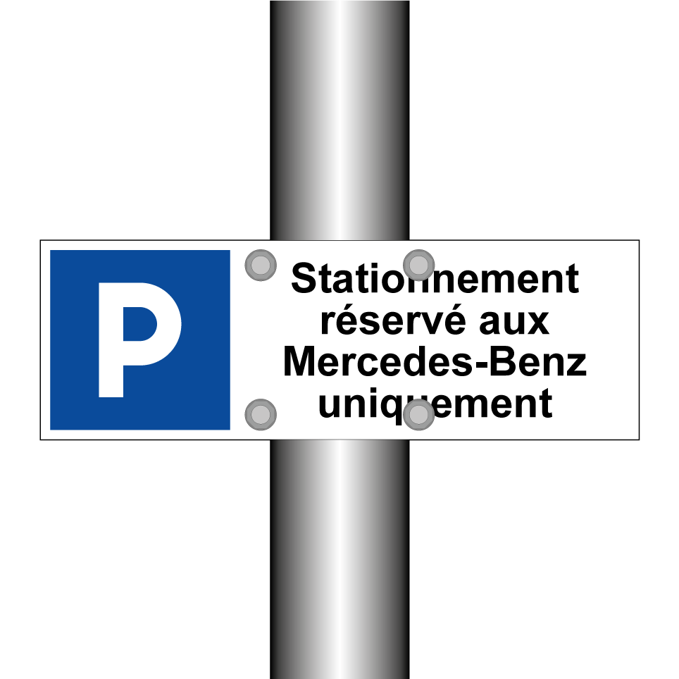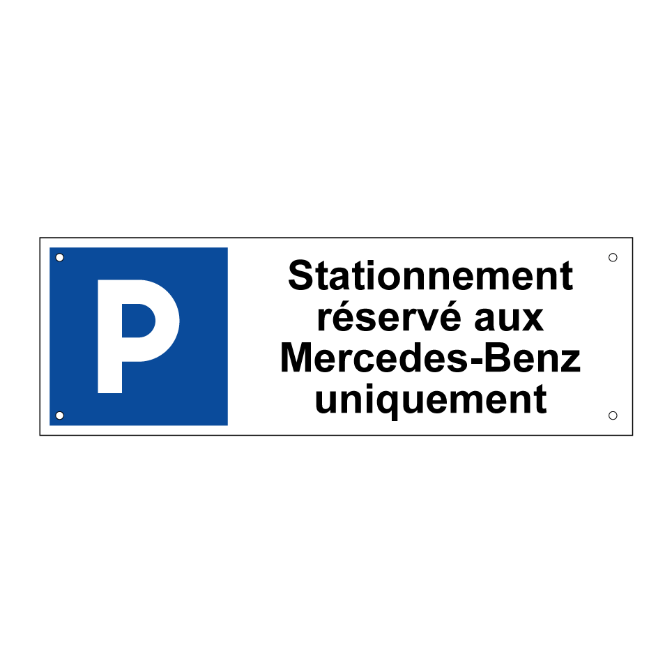 Panneau de stationnement avec le texte : "Stationnement réservé aux Mercedes-Benz uniquement" et une symbolique claire.