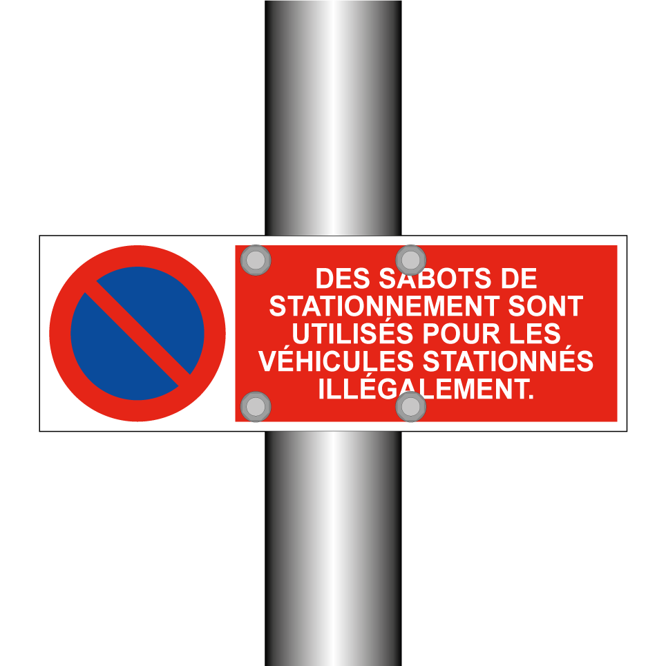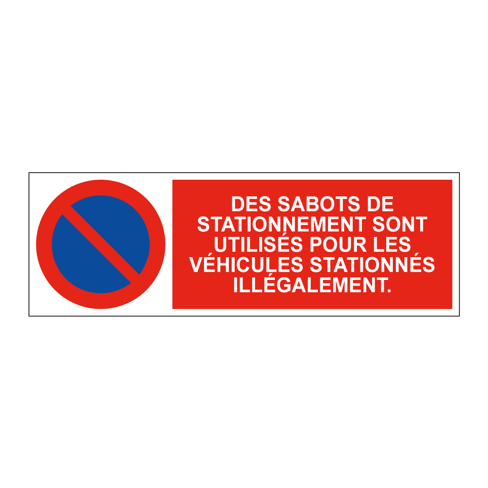 Panneau d'interdiction de stationner avec le texte : "Des sabots de stationnement sont utilisés pour les véhicules stationnés illégalement." et une symbolique claire.