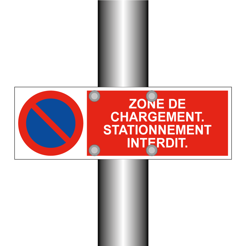 Panneau d'interdiction de stationner avec le texte : "Zone de chargement. Stationnement interdit." et une symbolique claire.