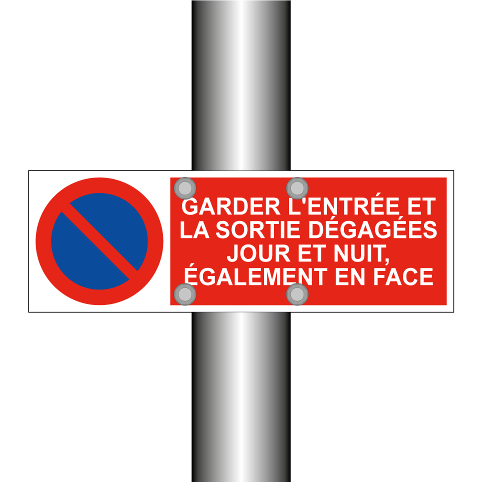 Panneau d'interdiction de stationner avec le texte : "Garder l'entrée et la sortie dégagées jour et nuit, également en face" et une symbolique claire.