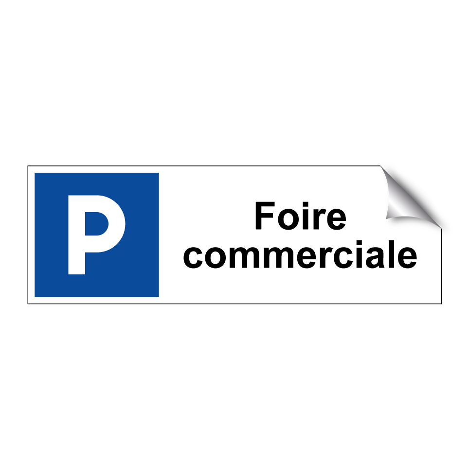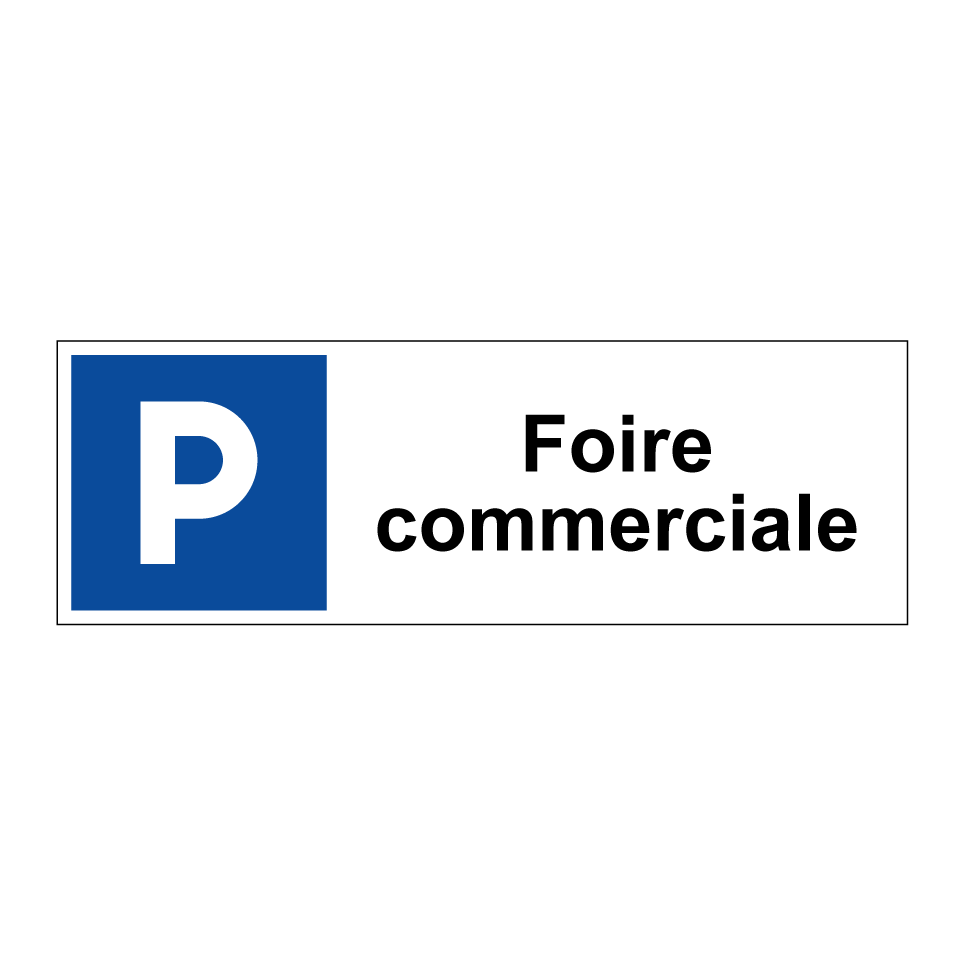 Panneau de stationnement avec le texte : "Foire commerciale" et une symbolique claire.
