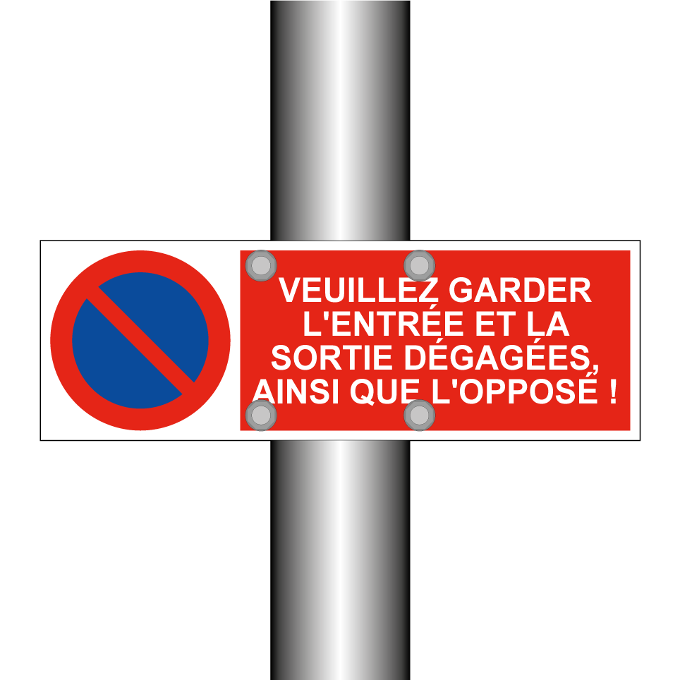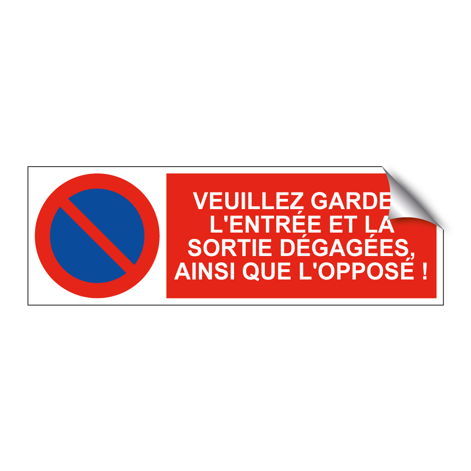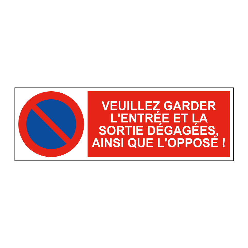Panneau d'interdiction de stationner avec le texte : "Veuillez garder l'entrée et la sortie dégagées, ainsi que l'opposé !" et une symbolique claire.