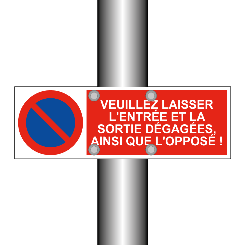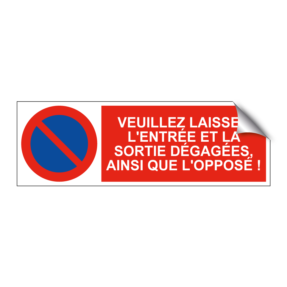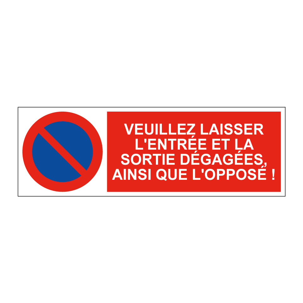 Panneau d'interdiction de stationner avec le texte : "Veuillez laisser l'entrée et la sortie dégagées, ainsi que l'opposé !" et une symbolique claire.