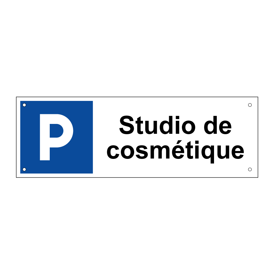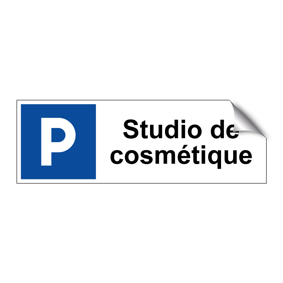 Panneau de stationnement avec le texte : "Studio de cosmétique" et une symbolique claire.