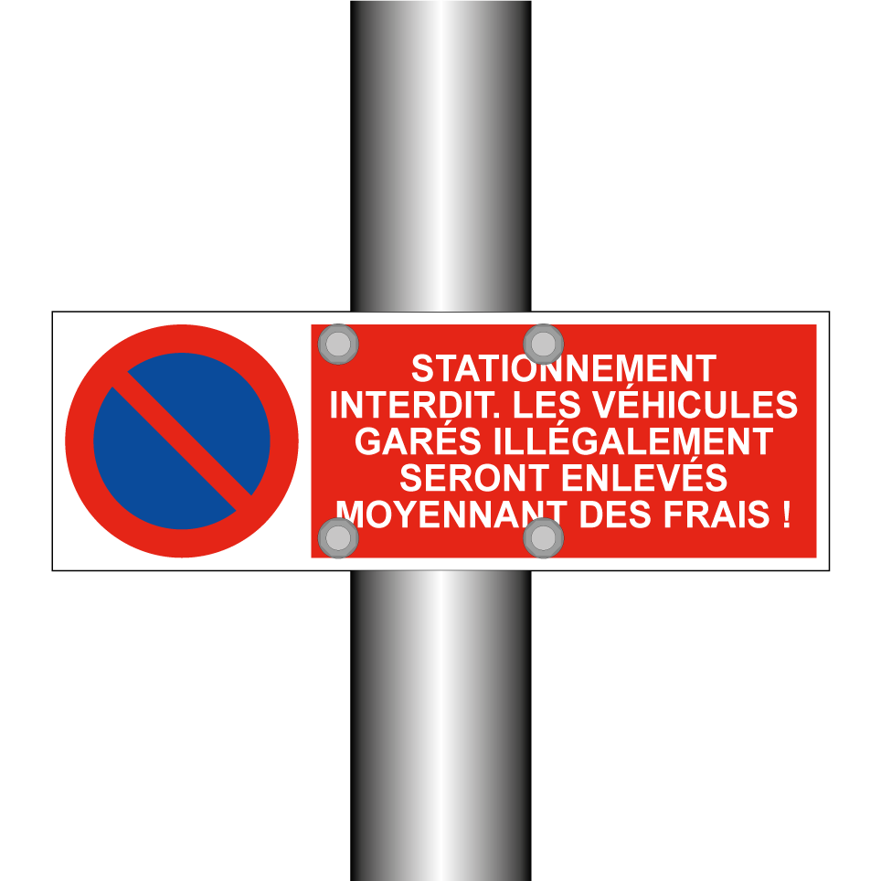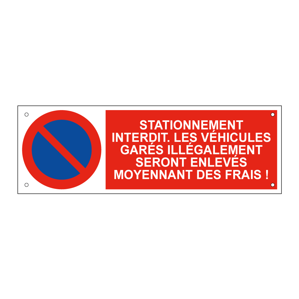 Panneau d'interdiction de stationner avec le texte : "Stationnement interdit. Les véhicules garés illégalement seront enlevés moyennant des frais !" et une symbolique claire.