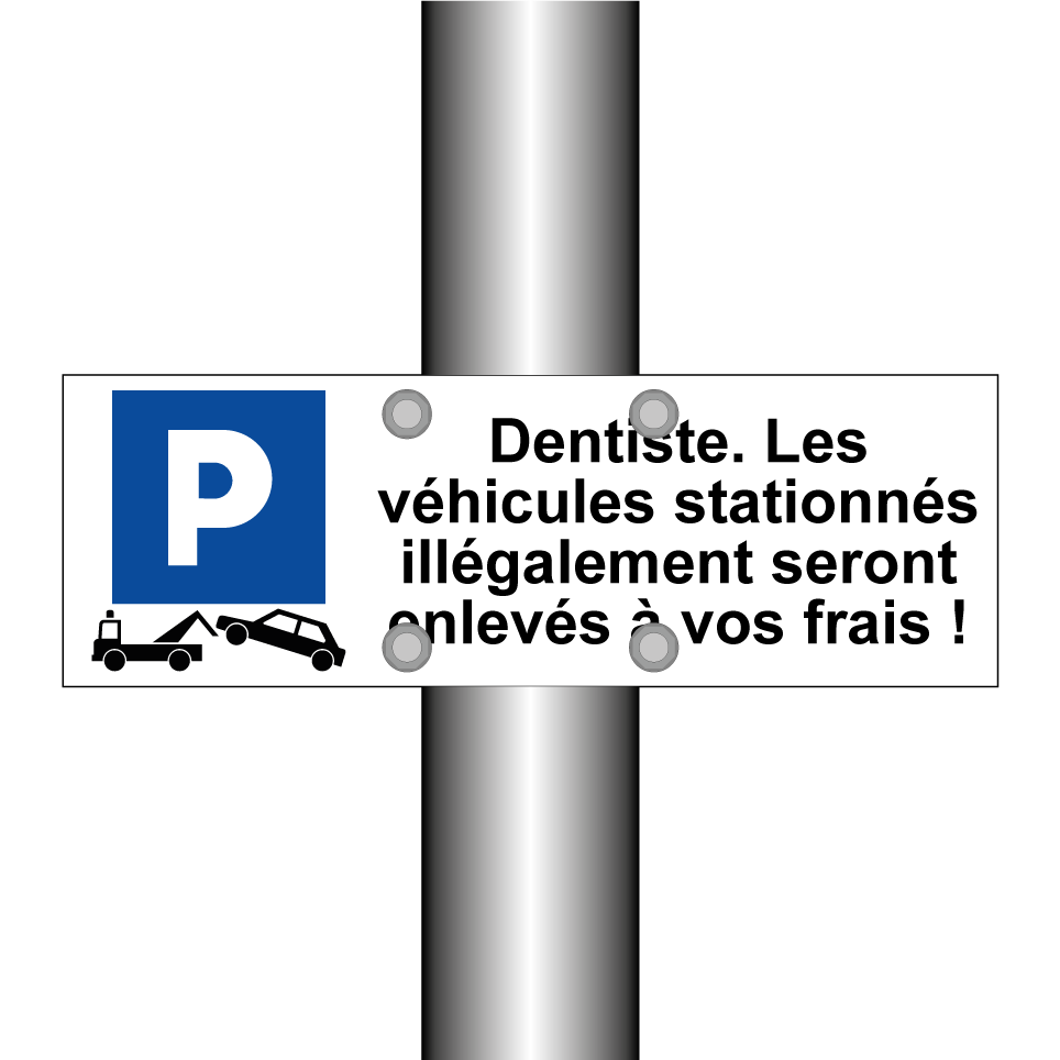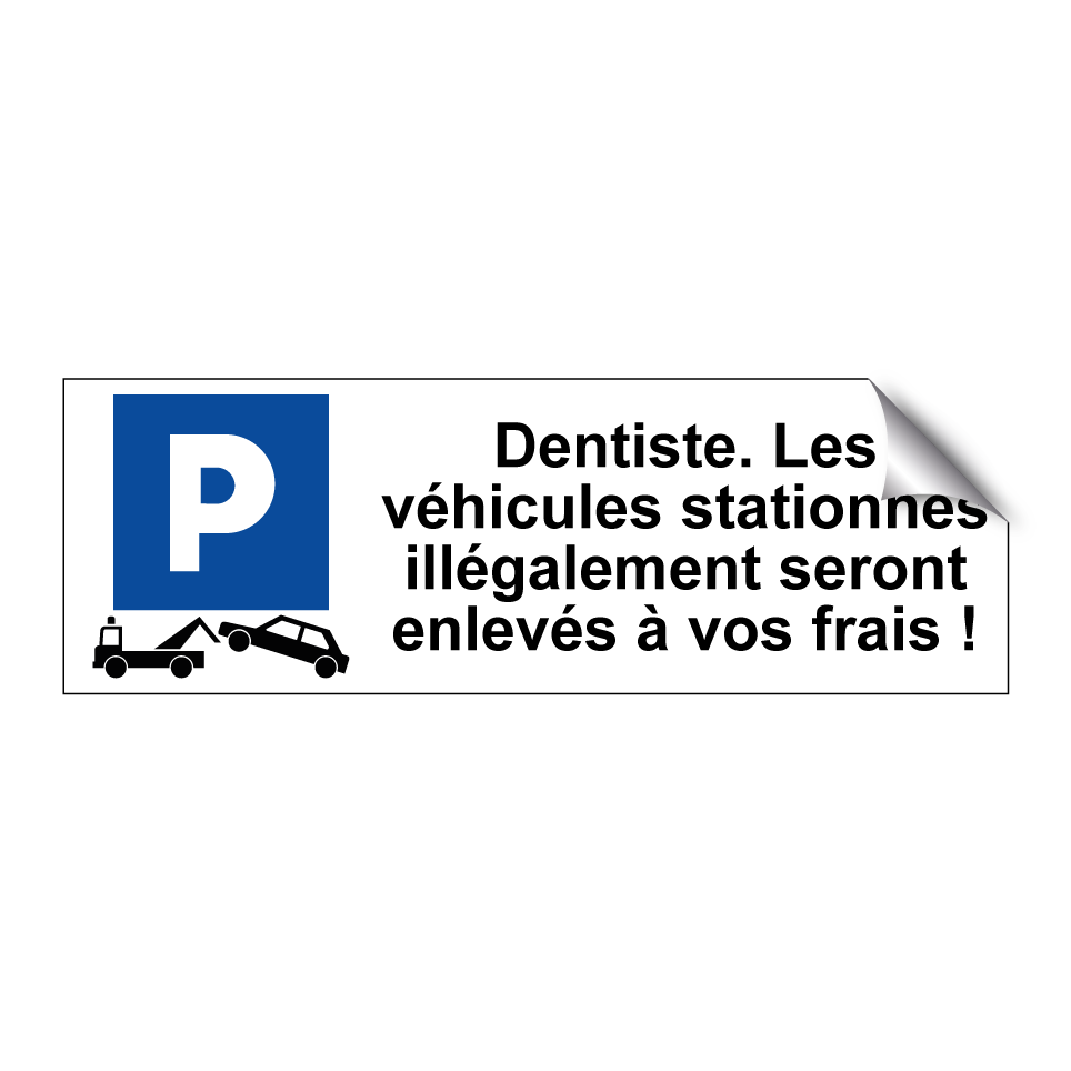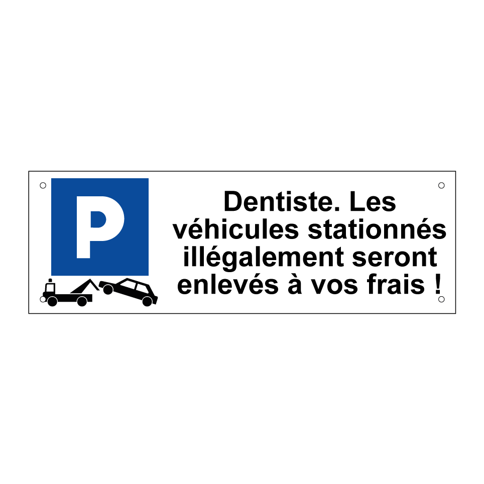 Panneau de stationnement avec le texte : "Dentiste. Les véhicules stationnés illégalement seront enlevés à vos frais !" et une symbolique claire.