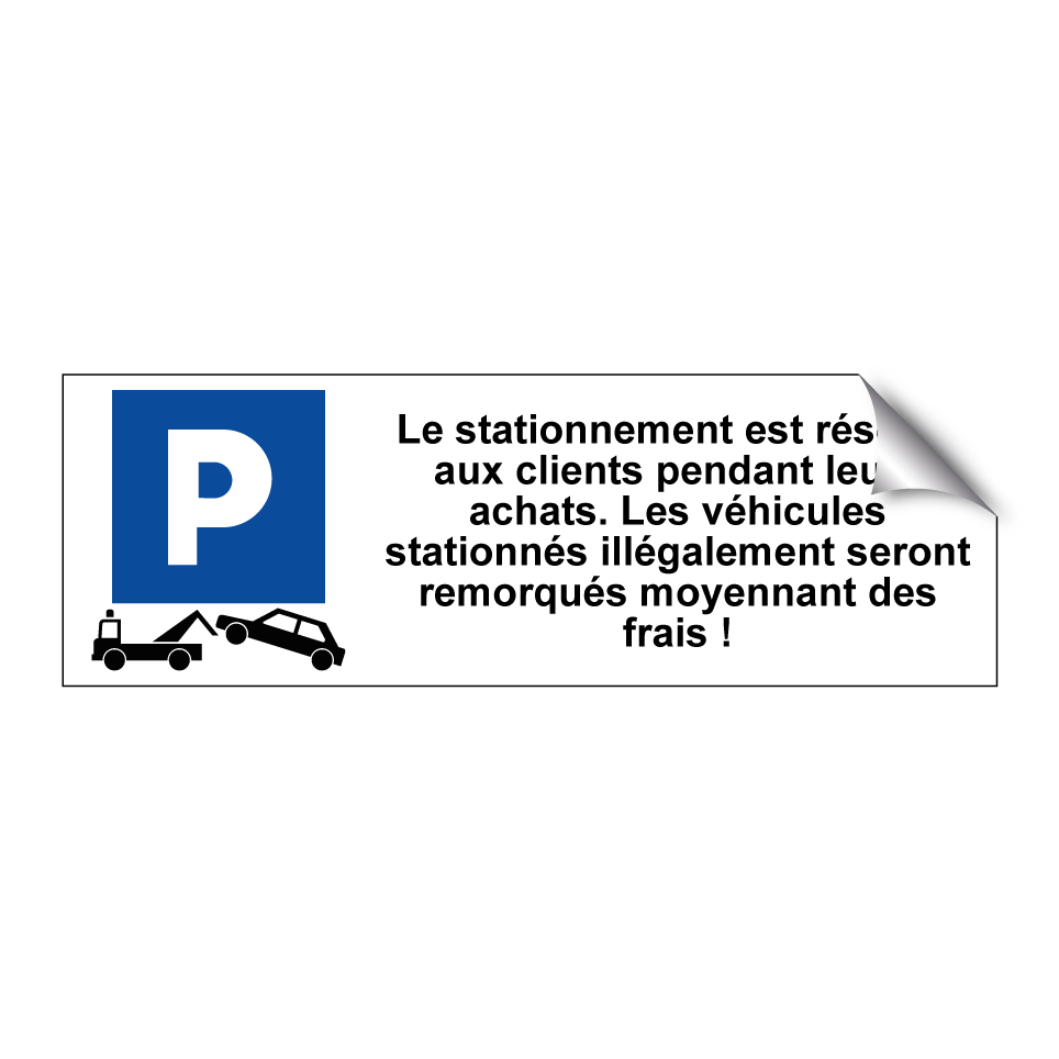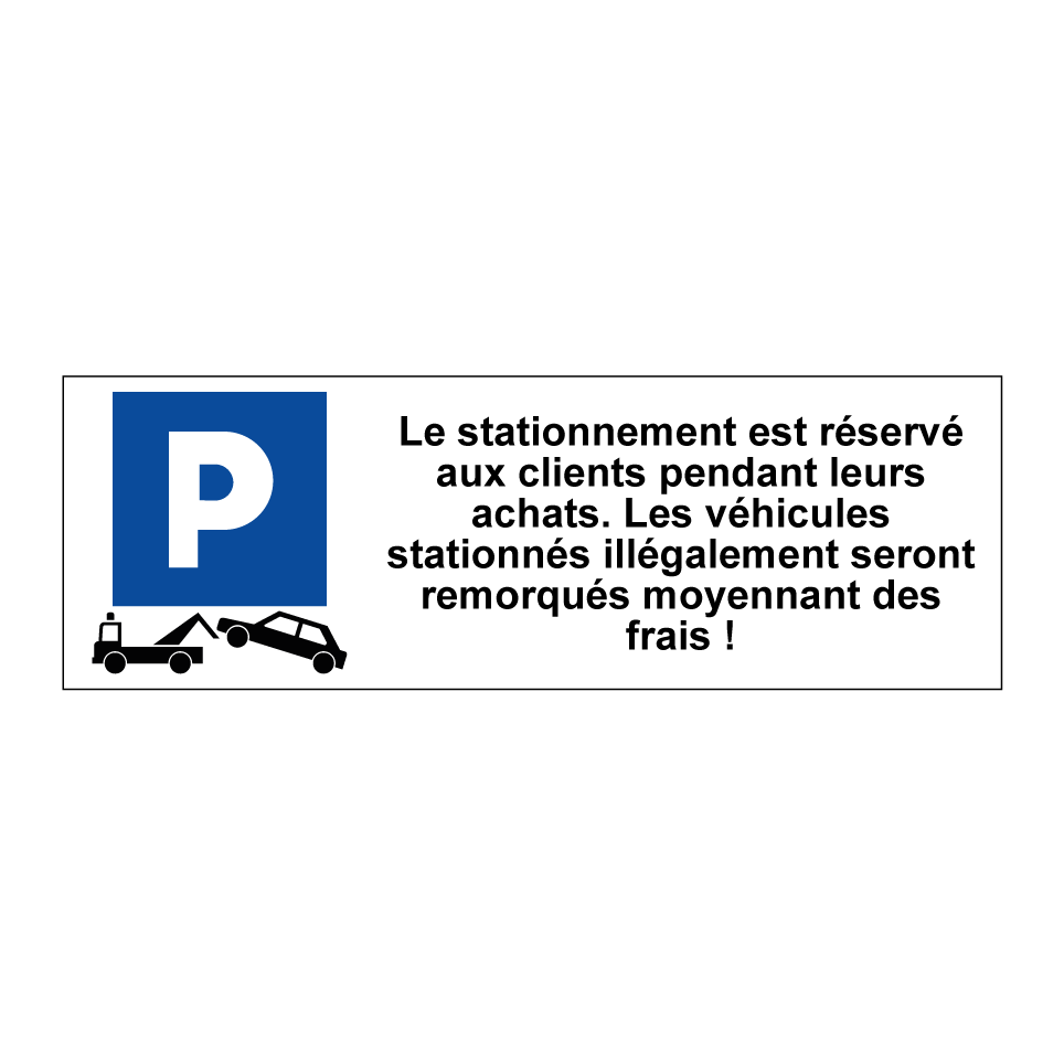 Panneau de stationnement avec le texte : "Le stationnement est réservé aux clients pendant leurs achats. Les véhicules stationnés illégalement seront remorqués moyennant des frais !" et une symbolique claire.