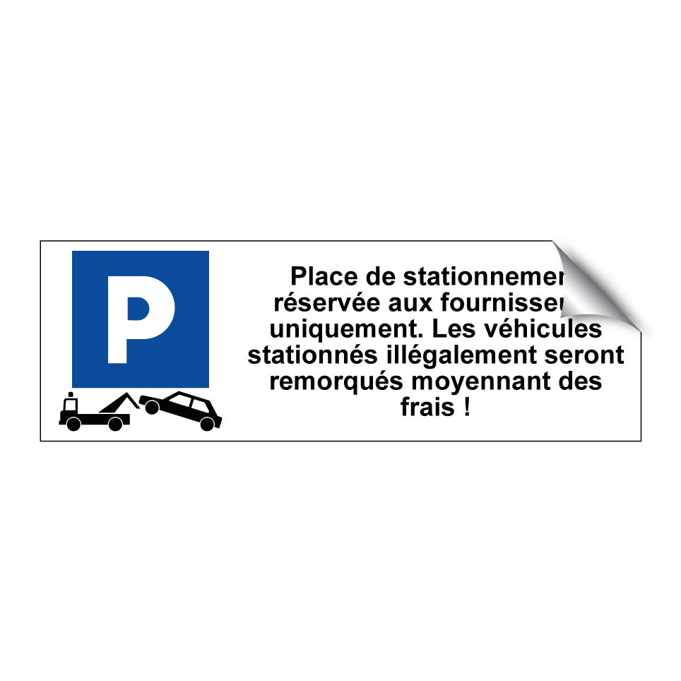 Panneau de stationnement avec le texte : "Place de stationnement réservée aux fournisseurs uniquement. Les véhicules stationnés illégalement seront remorqués moyennant des frais !" et une symbolique claire.