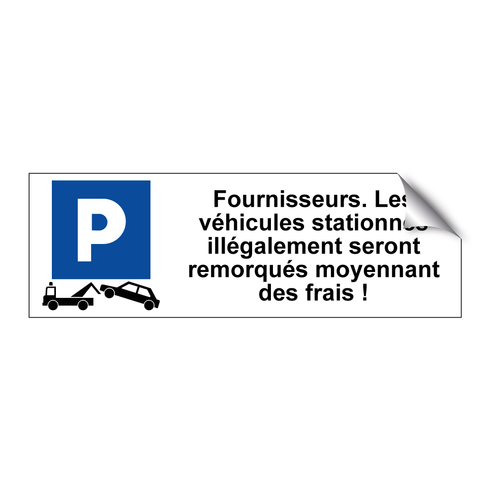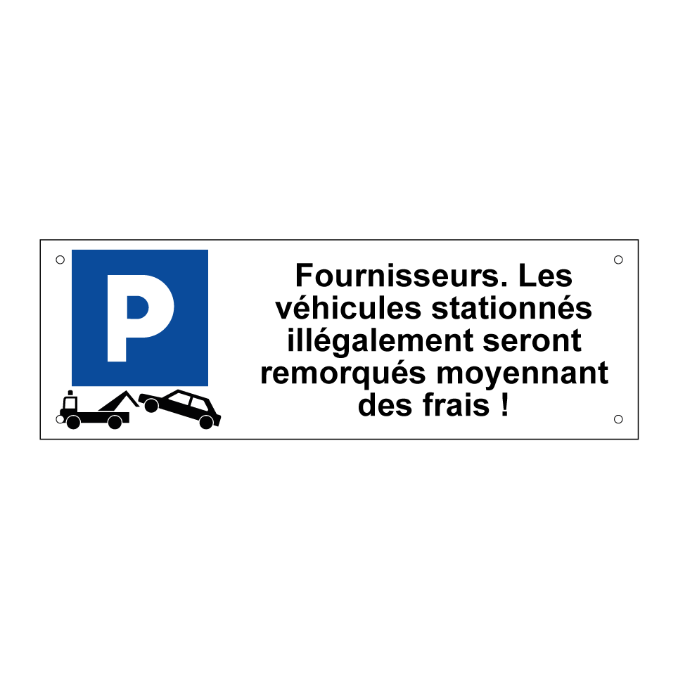 Panneau de stationnement avec le texte : "Fournisseurs. Les véhicules stationnés illégalement seront remorqués moyennant des frais !" et une symbolique claire.