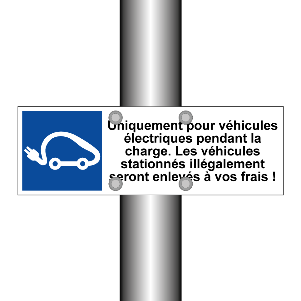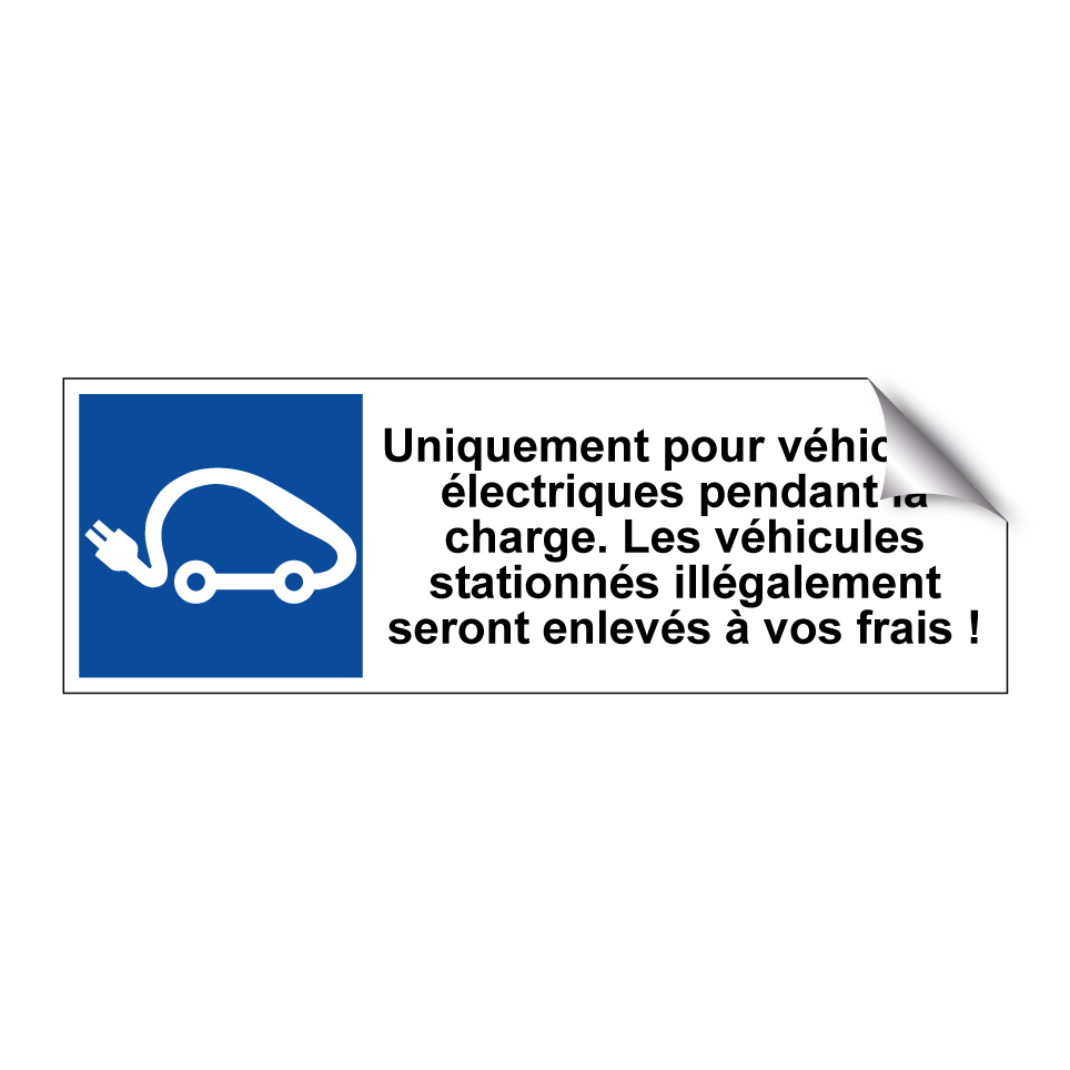 Panneau de stationnement avec le texte : "Uniquement pour véhicules électriques pendant la charge. Les véhicules stationnés illégalement seront enlevés à vos frais !" et une symbolique claire.