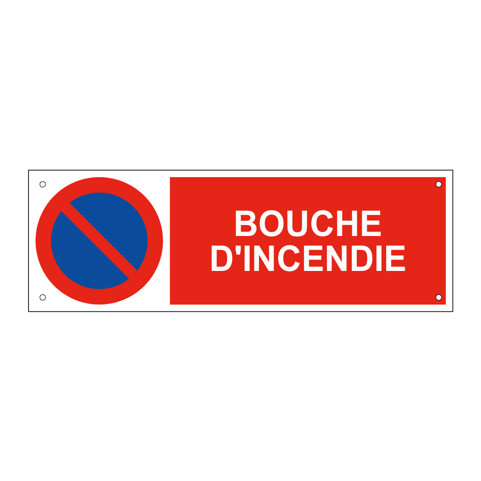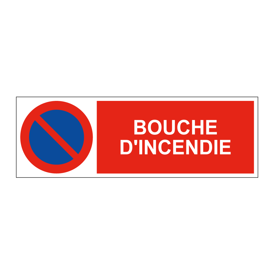 Panneau d'interdiction de stationner avec le texte : "Bouche d'incendie" et une symbolique claire.