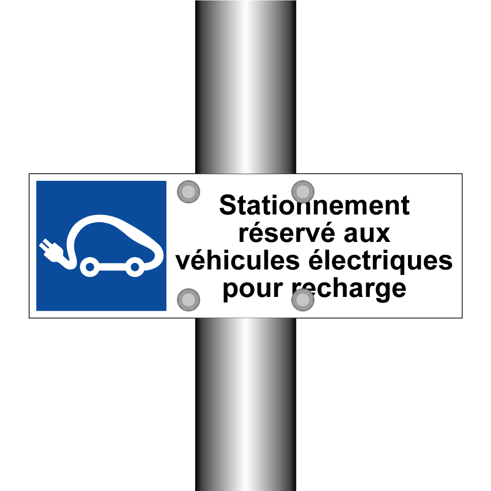 Panneau de stationnement avec le texte : "Stationnement réservé aux véhicules électriques pour recharge" et une symbolique claire.