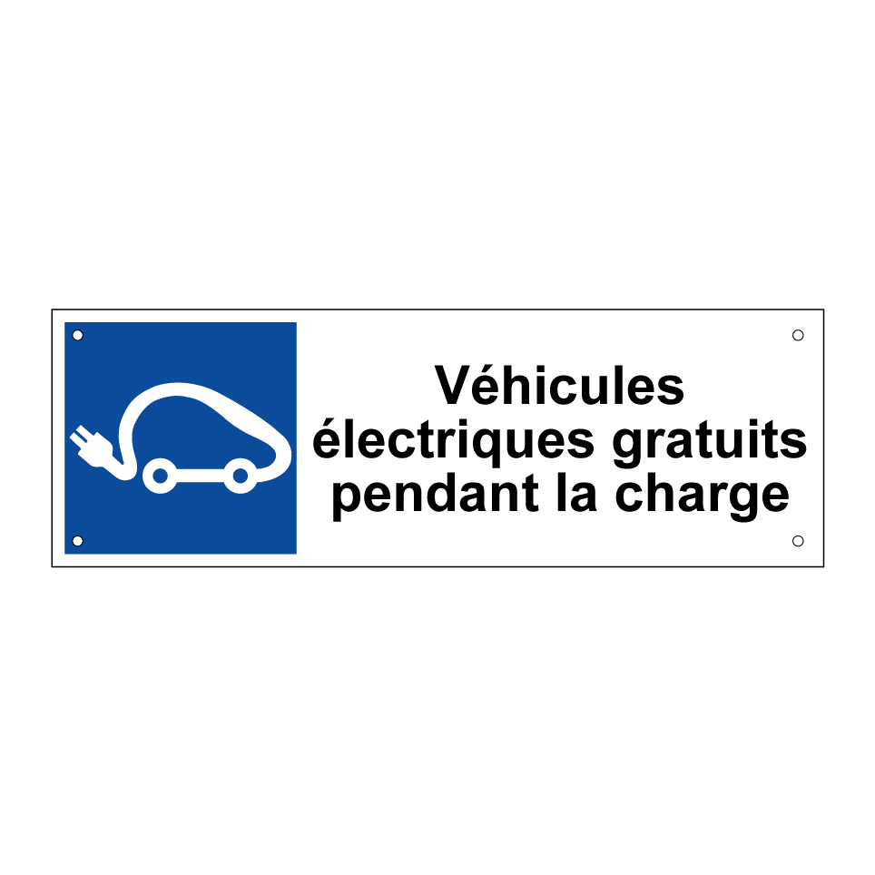 Panneau de stationnement avec le texte : "Véhicules électriques gratuits pendant la charge" et une symbolique claire.
