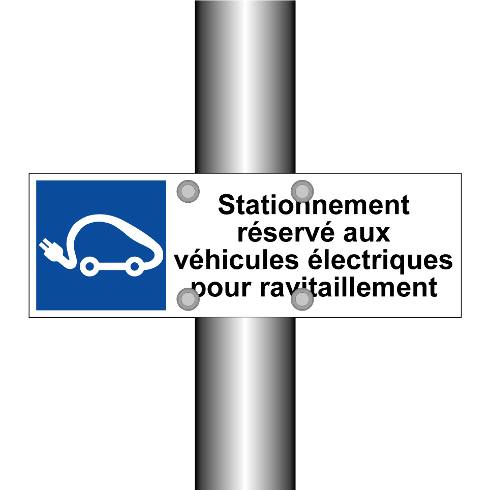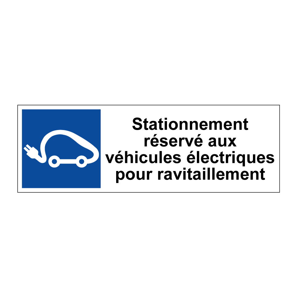 Panneau de stationnement avec le texte : "Stationnement réservé aux véhicules électriques pour ravitaillement" et une symbolique claire.