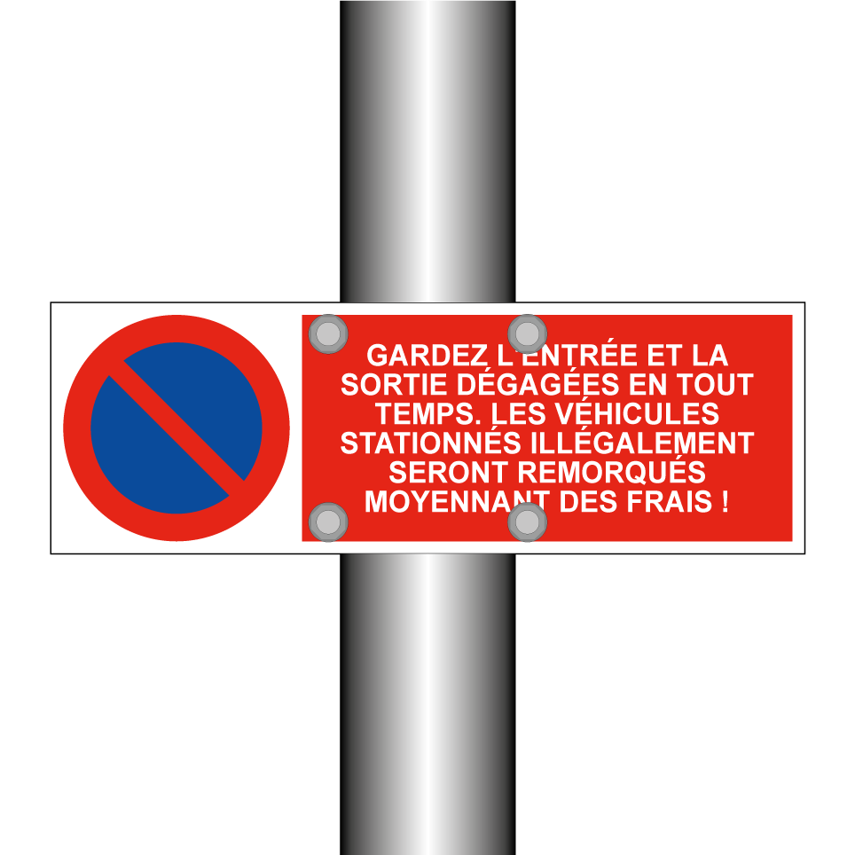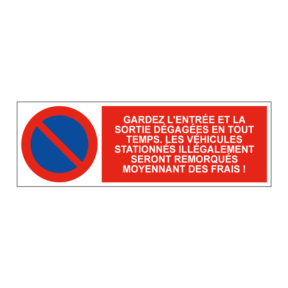 Panneau d'interdiction de stationner avec le texte : "Gardez l'entrée et la sortie dégagées en tout temps. Les véhicules stationnés illégalement seront remorqués moyennant des frais !" et une symbolique claire.