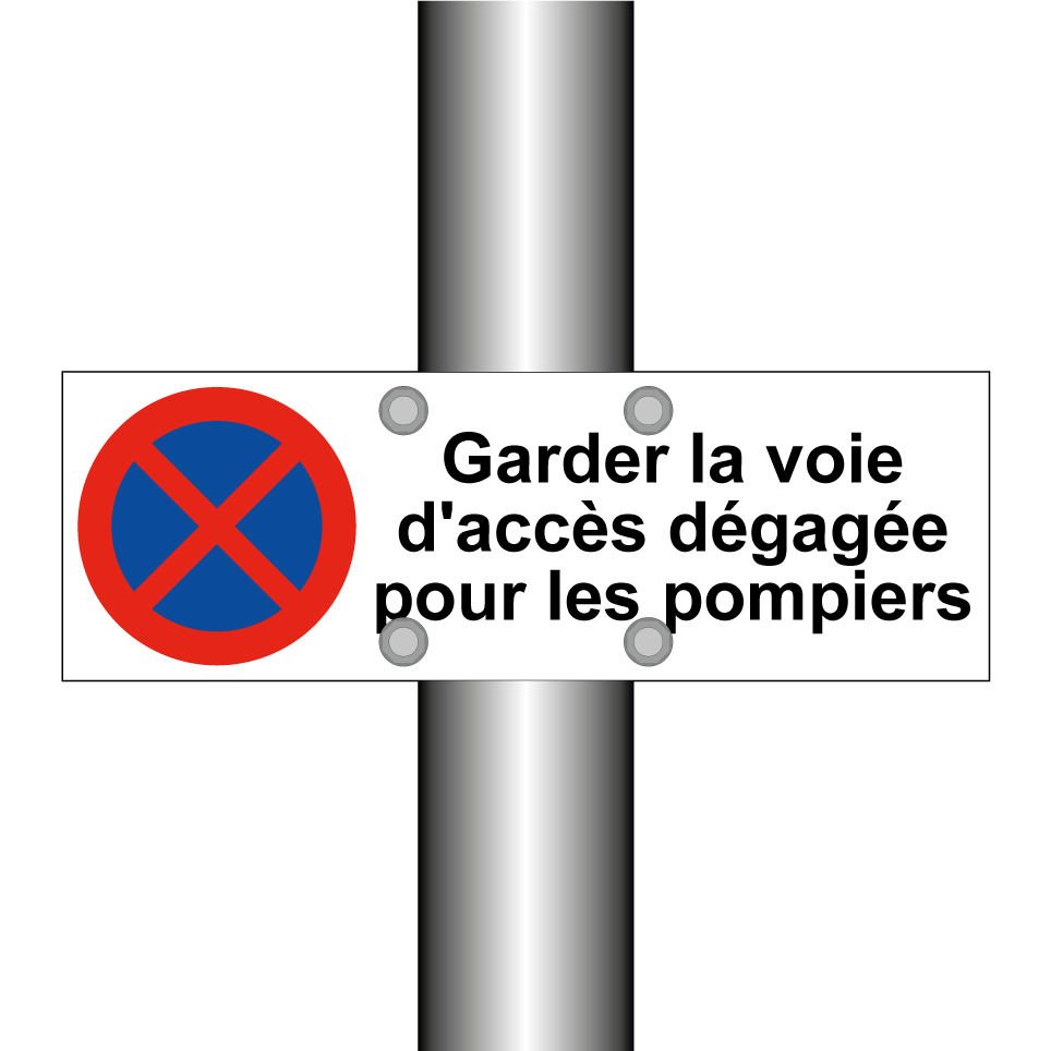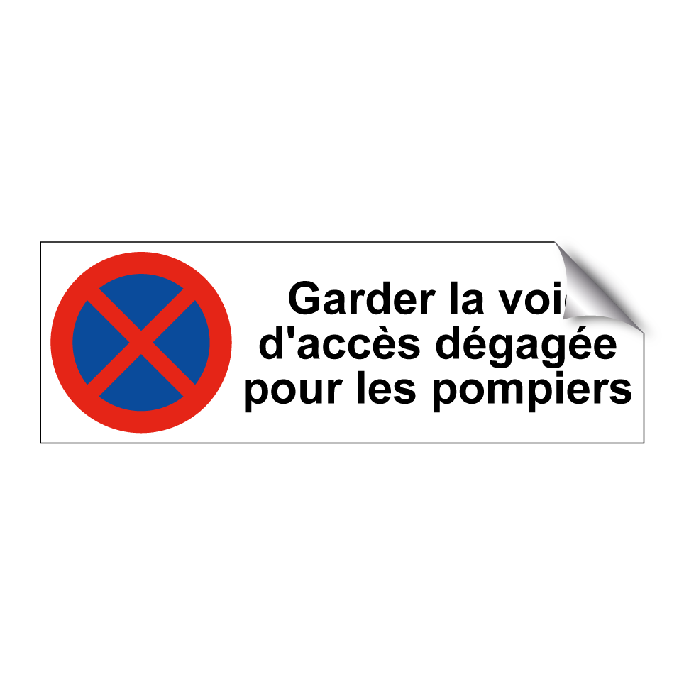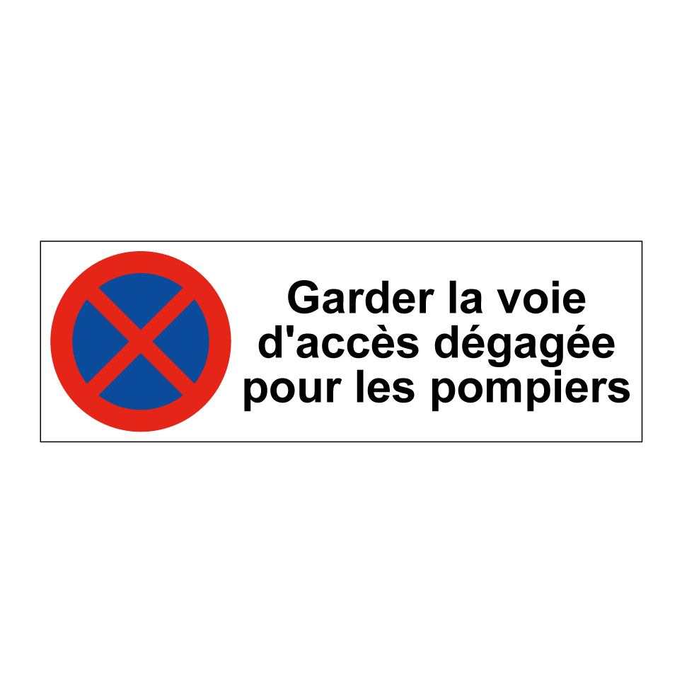 Panneau d'interdiction de stationner avec le texte : "Garder la voie d'accès dégagée pour les pompiers" et une symbolique claire.