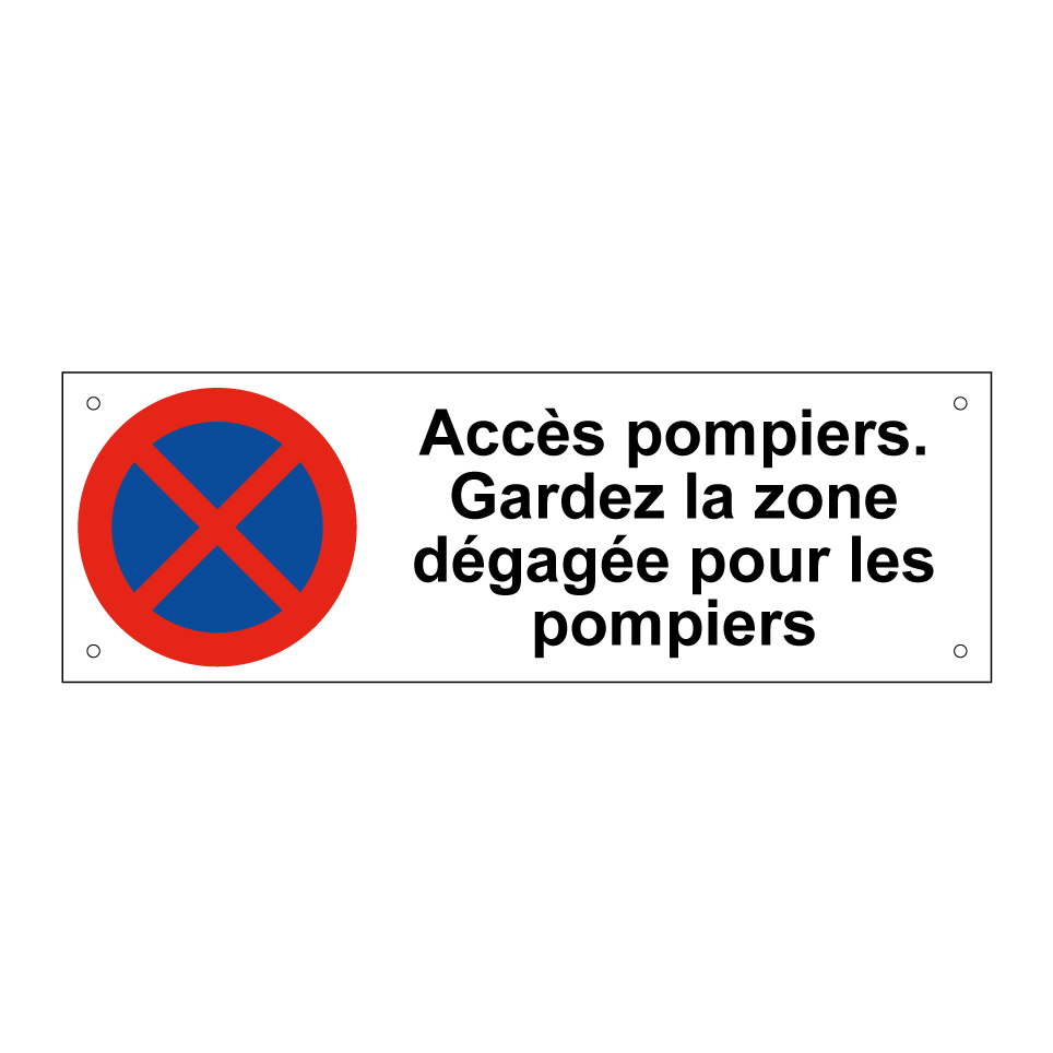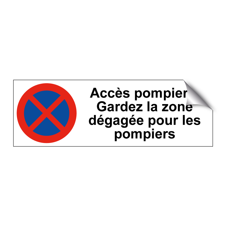 Panneau d'interdiction de stationner avec le texte : "Accès pompiers. Gardez la zone dégagée pour les pompiers" et une symbolique claire.