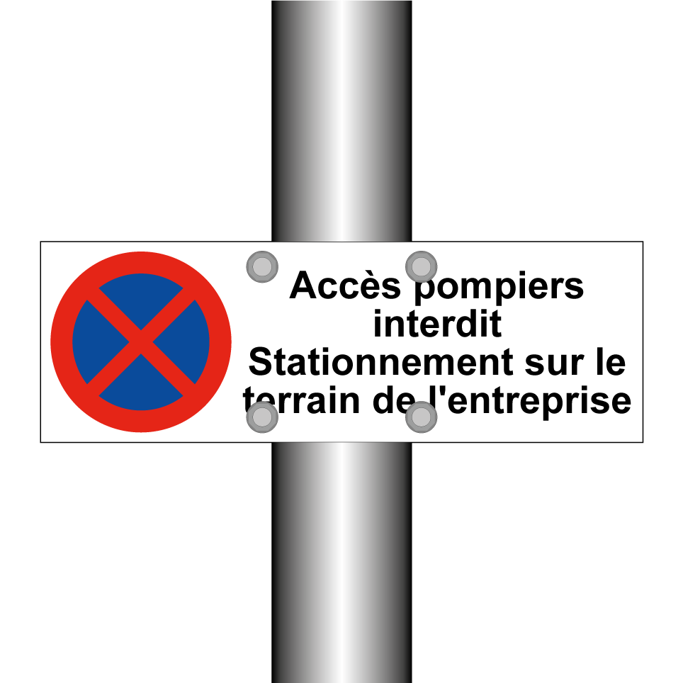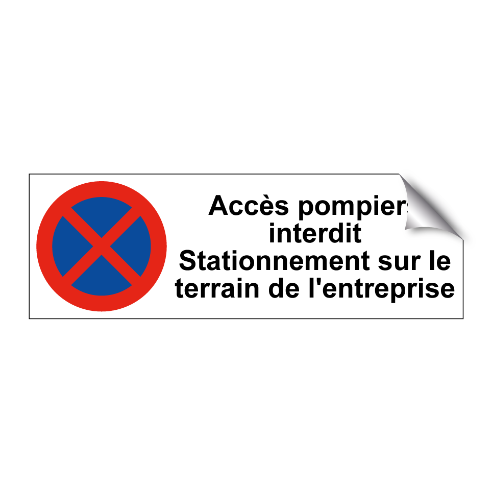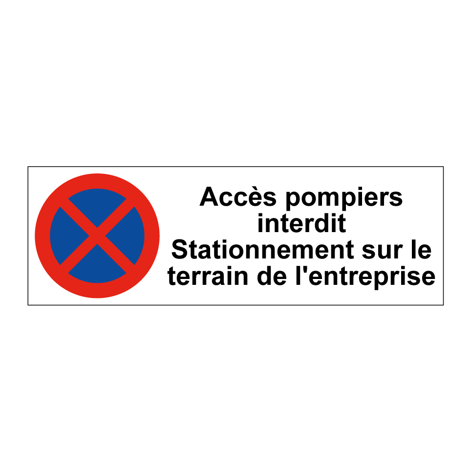 Panneau d'interdiction de stationner avec le texte : "Accès pompiers interdit Stationnement sur le terrain de l'entreprise" et une symbolique claire.