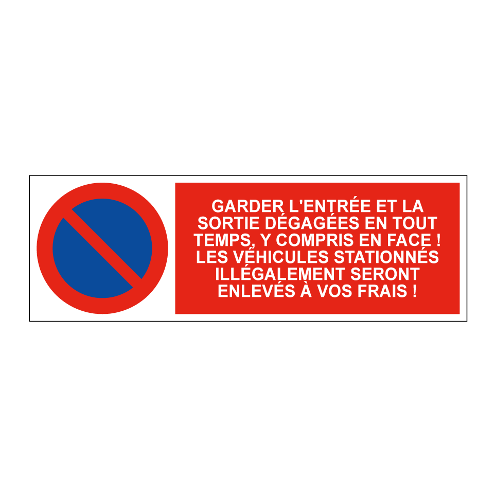 Panneau d'interdiction de stationner avec le texte : "Garder l'entrée et la sortie dégagées en tout temps, y compris en face ! Les véhicules stationnés illégalement seront enlevés à vos frais !" et une symbolique claire.