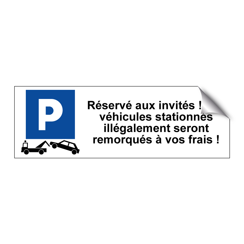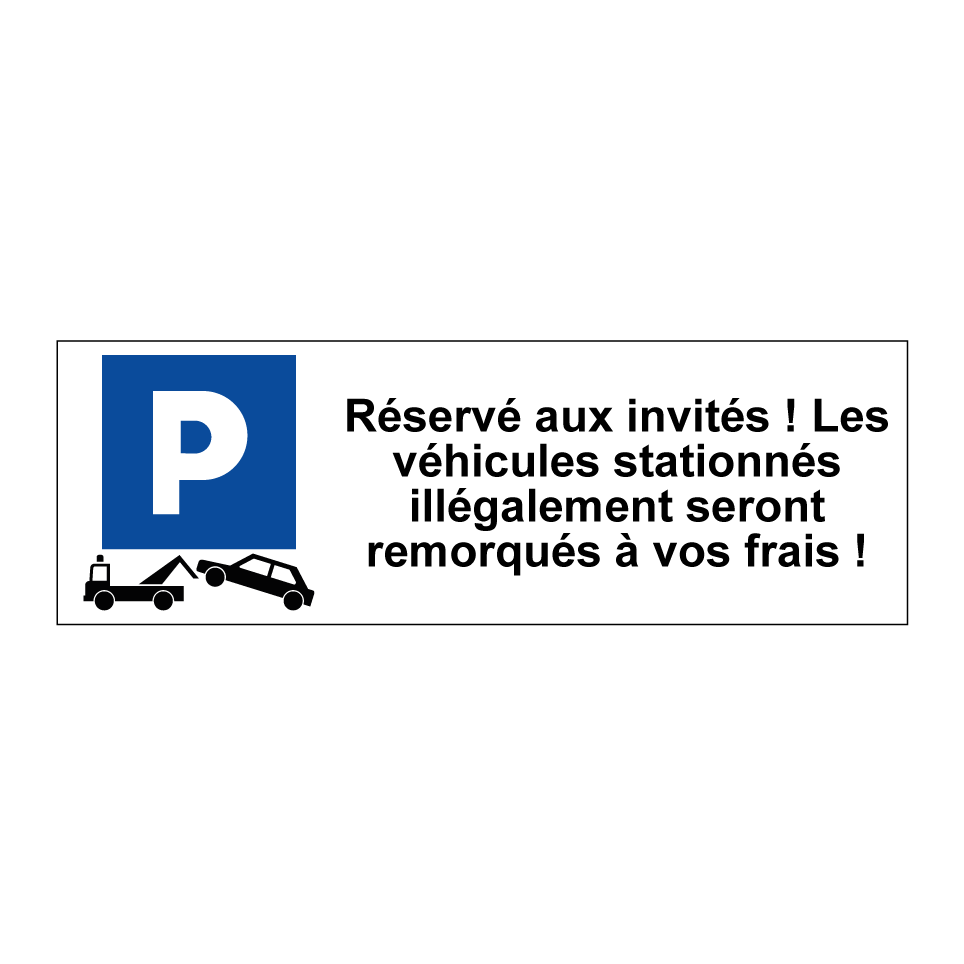 Panneau de stationnement avec le texte : "Réservé aux invités ! Les véhicules stationnés illégalement seront remorqués à vos frais !" et une symbolique claire.