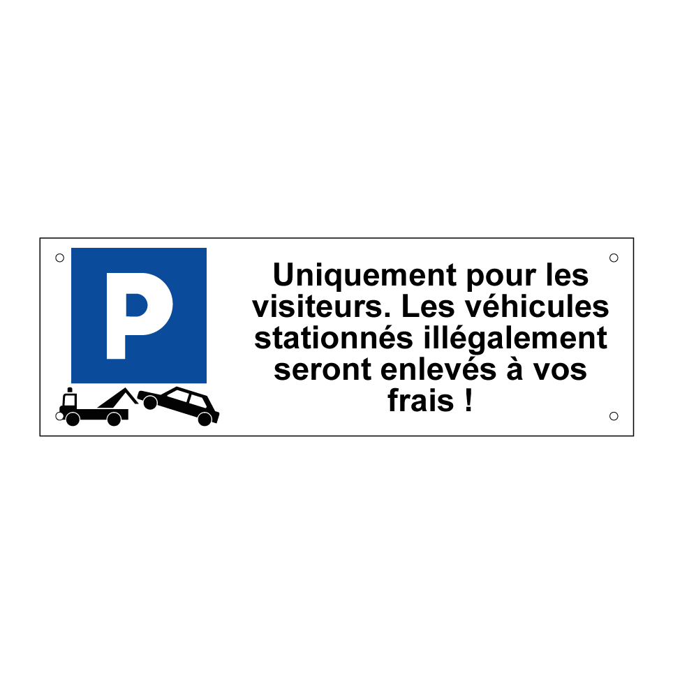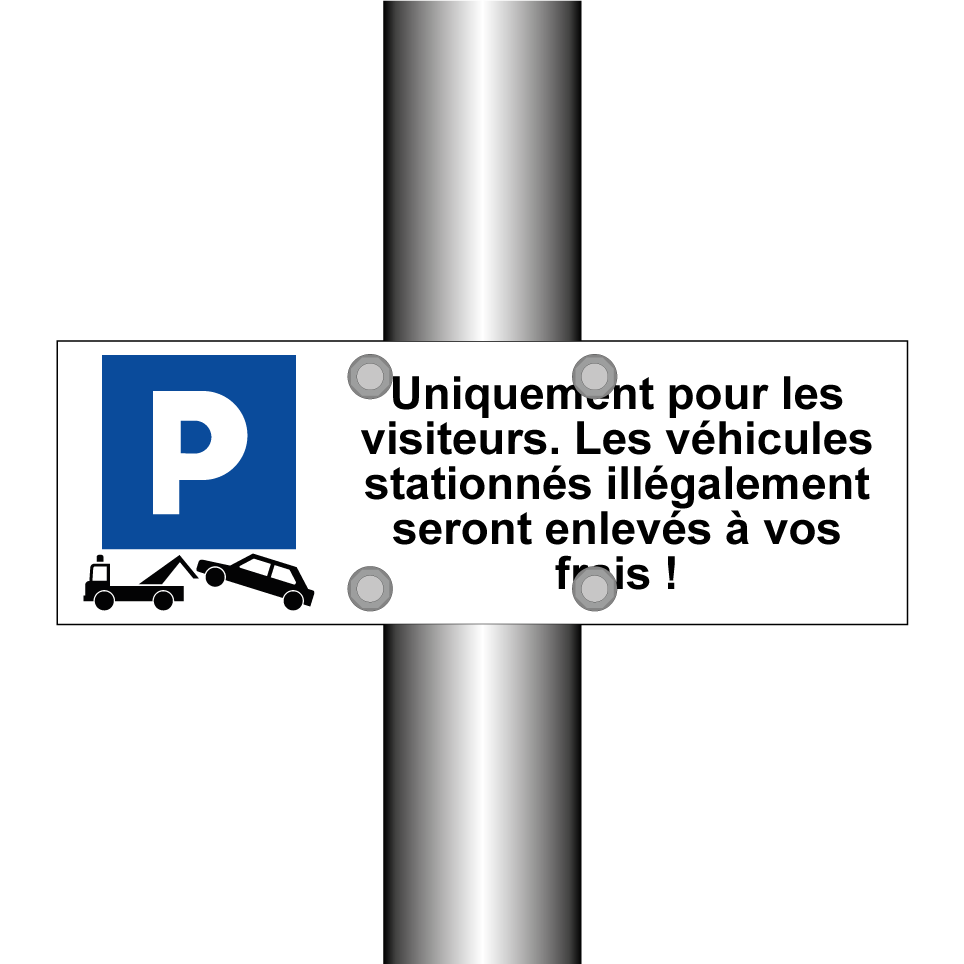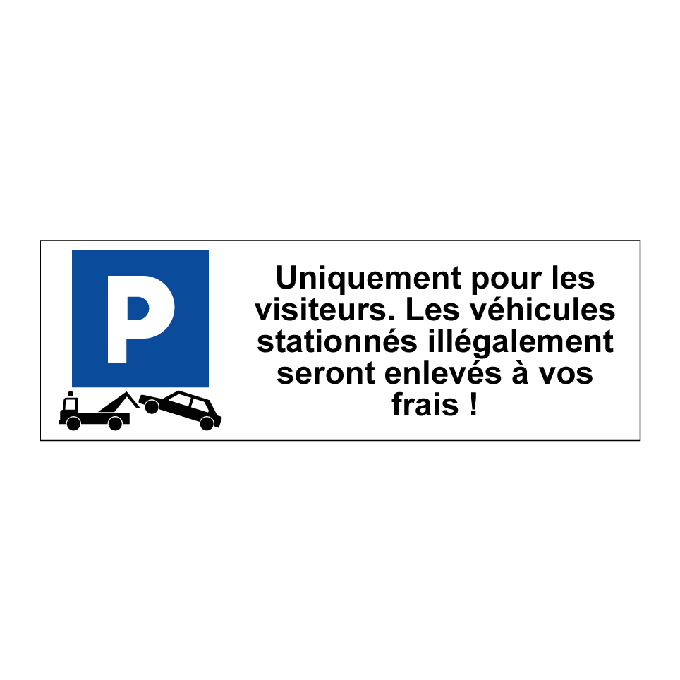 Panneau de stationnement avec le texte : "Uniquement pour les visiteurs. Les véhicules stationnés illégalement seront enlevés à vos frais !" et une symbolique claire.
