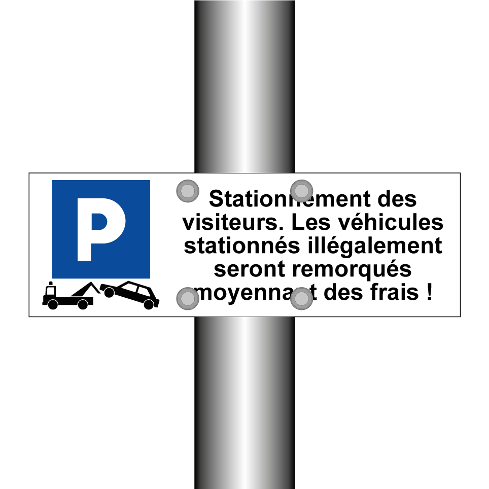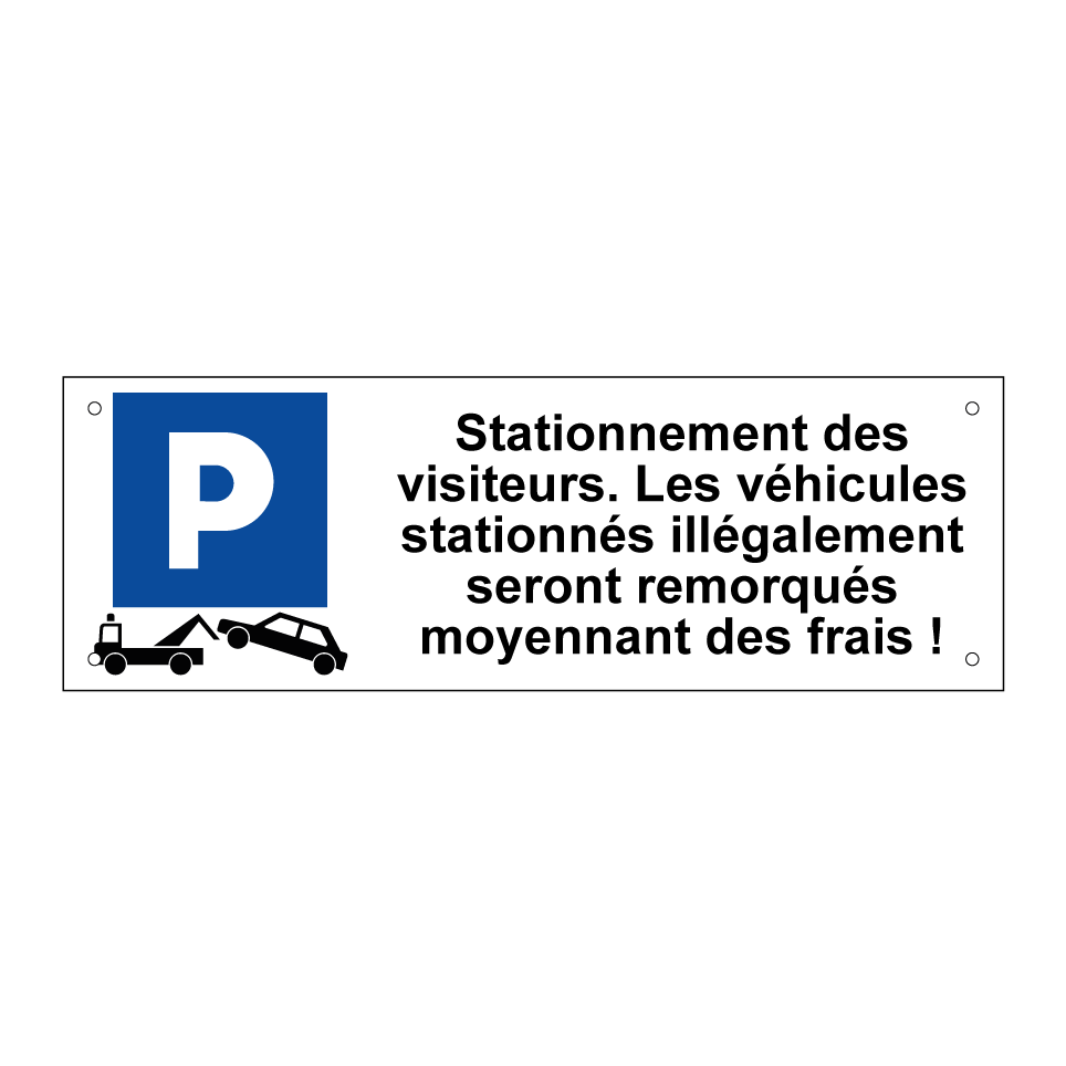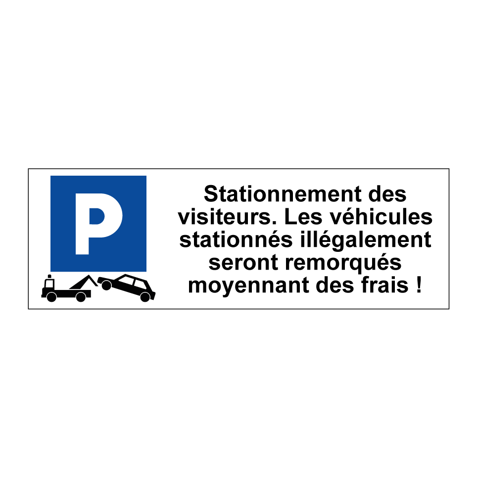 Panneau de stationnement avec le texte : "Stationnement des visiteurs. Les véhicules stationnés illégalement seront remorqués moyennant des frais !" et une symbolique claire.