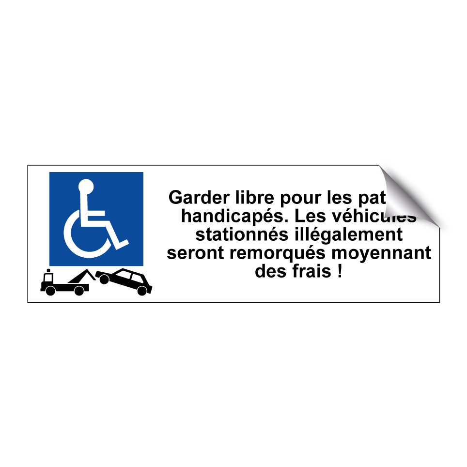 Panneau de stationnement avec le texte : "Garder libre pour les patients handicapés. Les véhicules stationnés illégalement seront remorqués moyennant des frais !" et une symbolique claire.