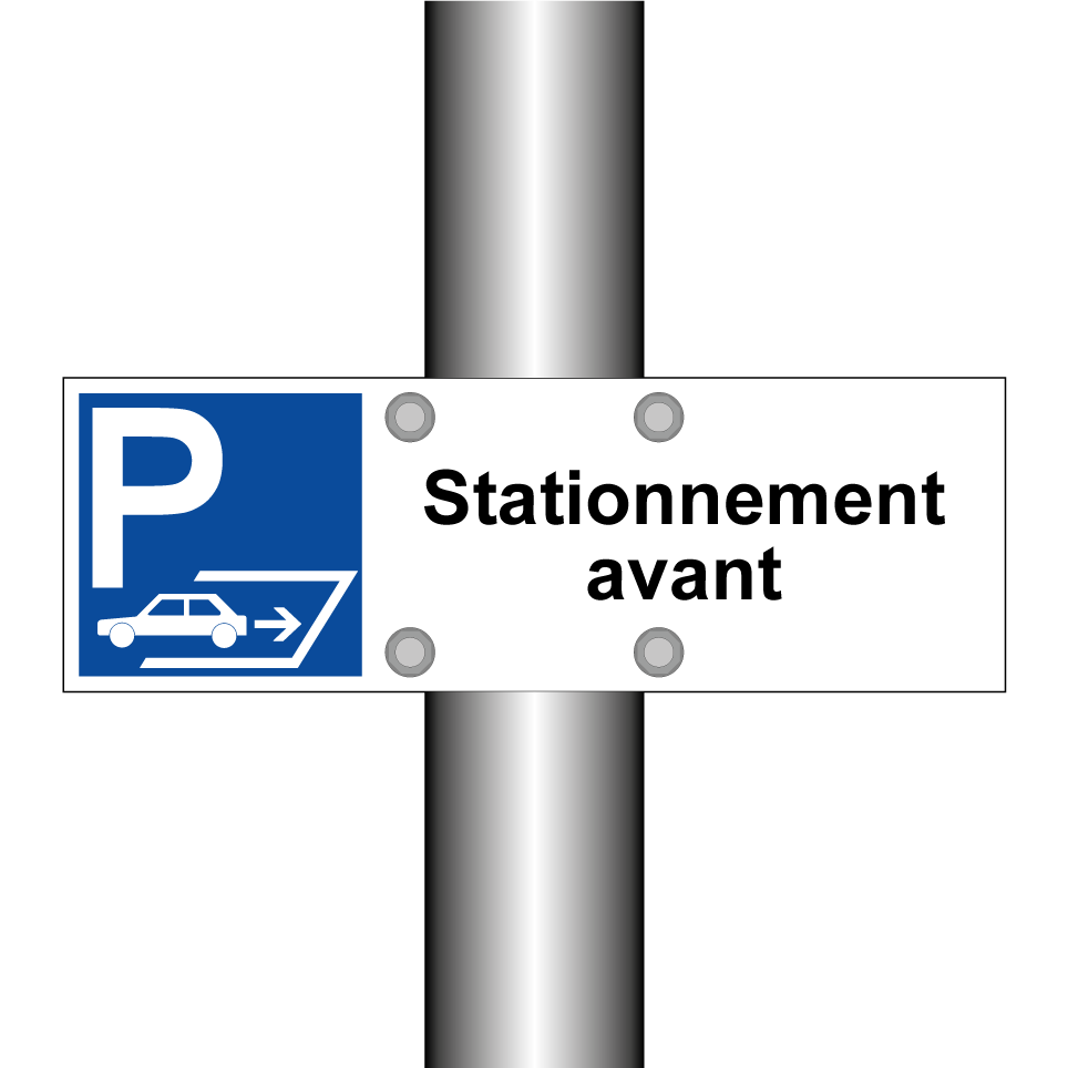 Panneau de stationnement avec le texte : "Stationnement avant" et une symbolique claire.