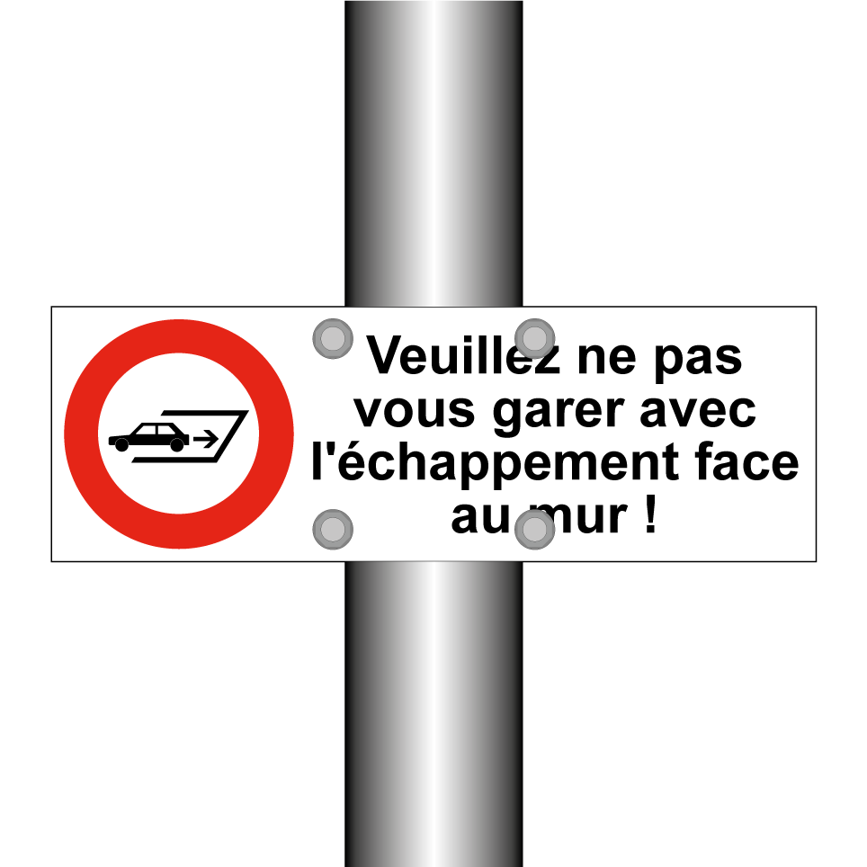 Panneau d'interdiction de stationner avec le texte : "Veuillez ne pas vous garer avec l'échappement face au mur !" et une symbolique claire.