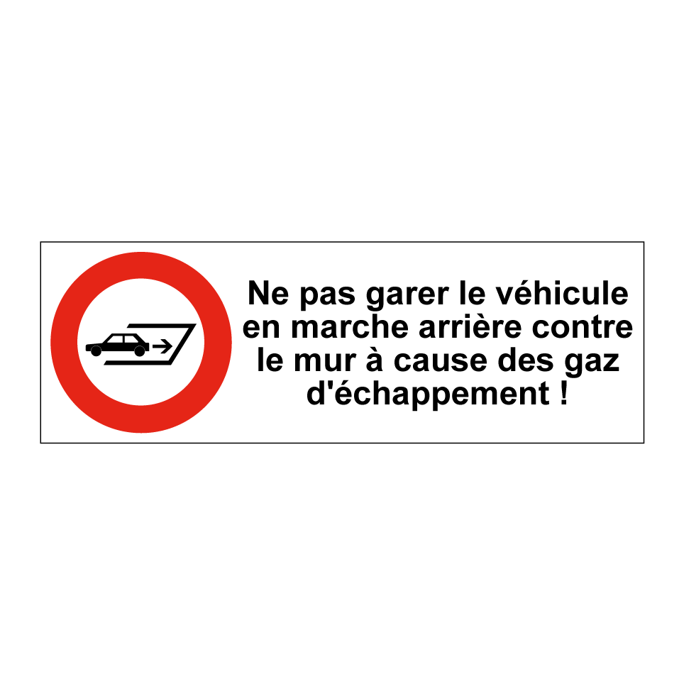 Panneau d'interdiction de stationner avec le texte : "Ne pas garer le véhicule en marche arrière contre le mur à cause des gaz d'échappement !" et une symbolique claire.