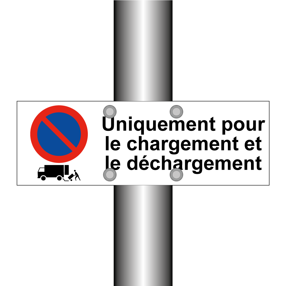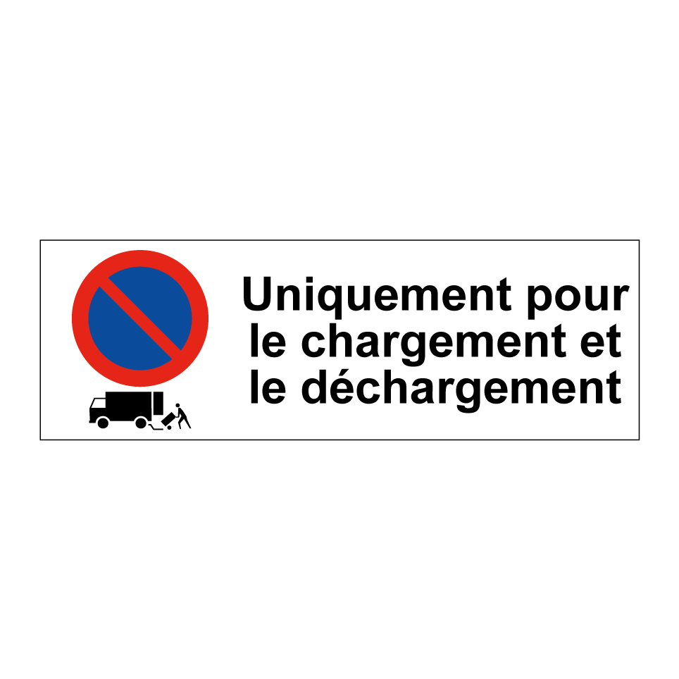 Panneau d'interdiction de stationner avec le texte : "Uniquement pour le chargement et le déchargement" et une symbolique claire.