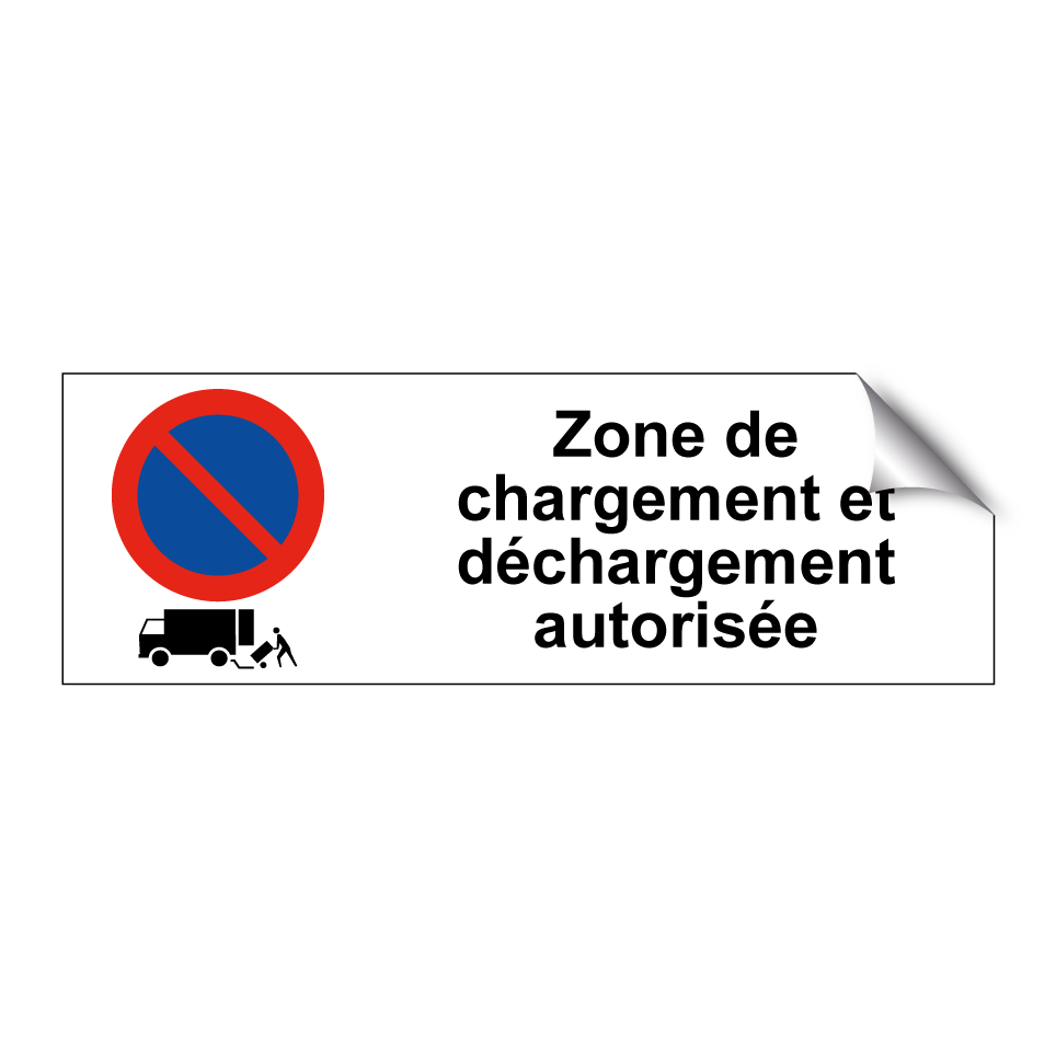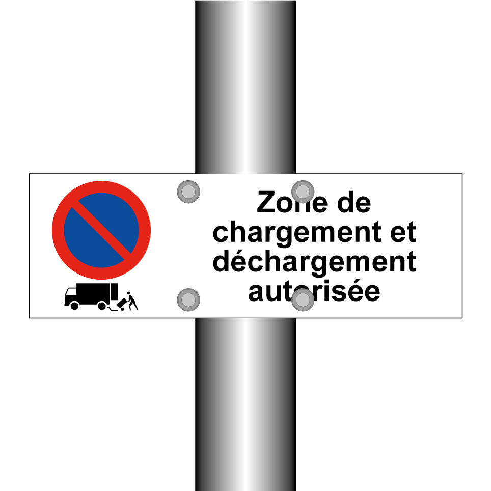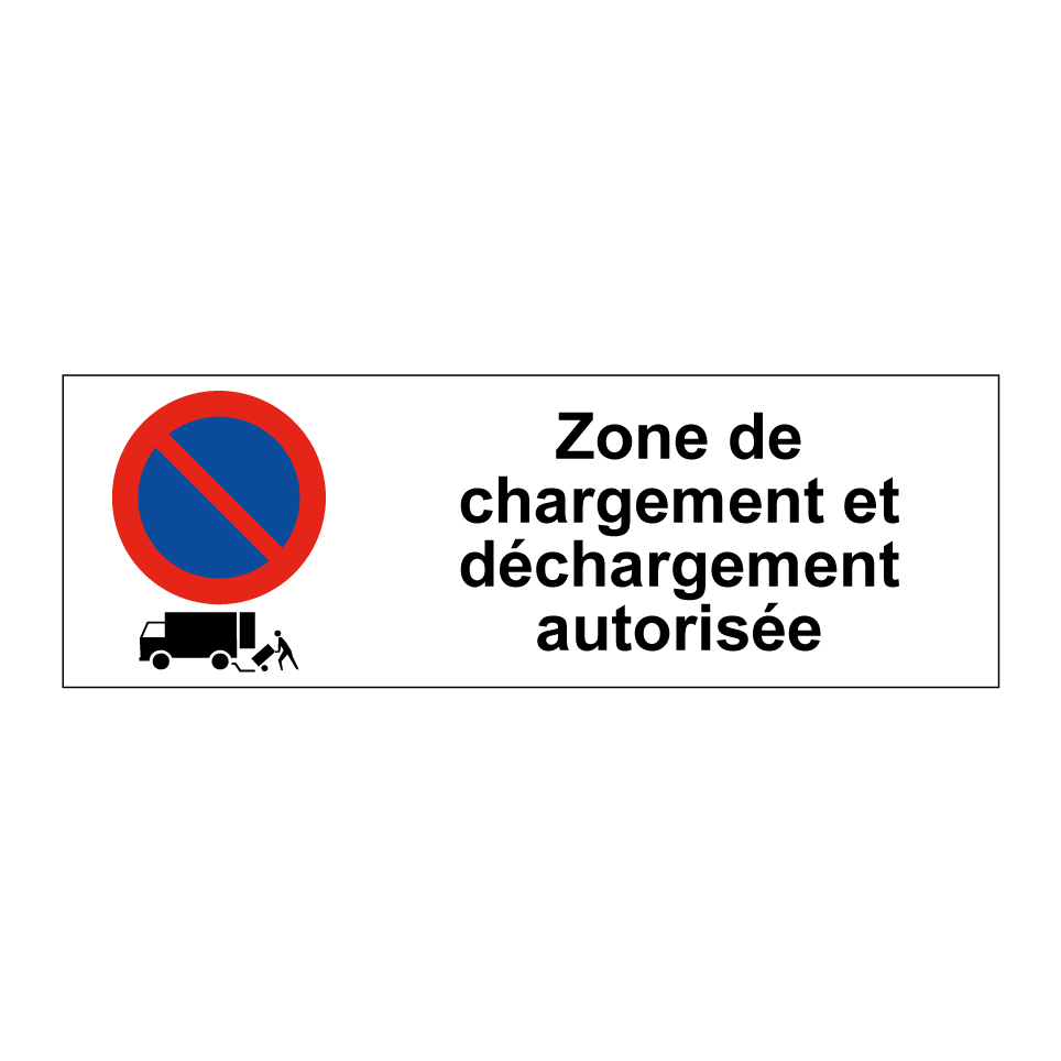 Panneau d'interdiction de stationner avec le texte : "Zone de chargement et déchargement autorisée" et une symbolique claire.