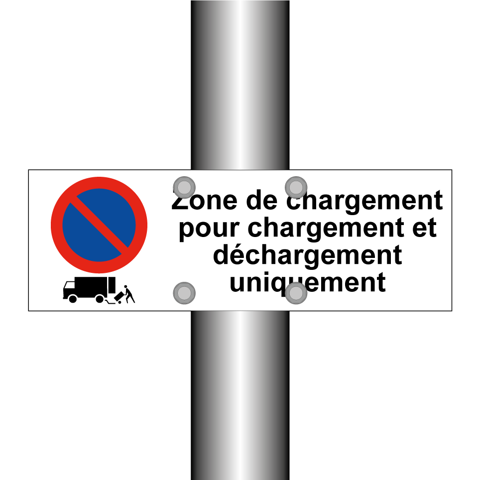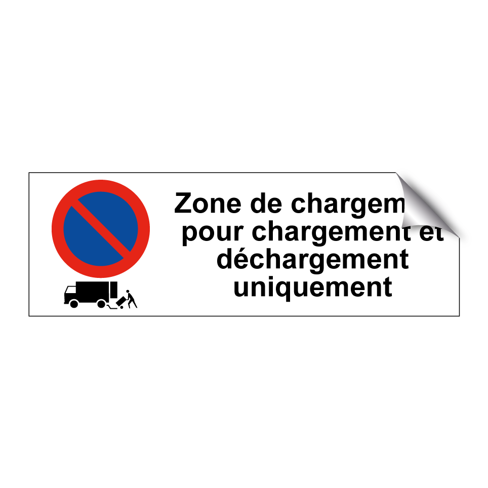 Panneau d'interdiction de stationner avec le texte : "Zone de chargement pour chargement et déchargement uniquement" et une symbolique claire.
