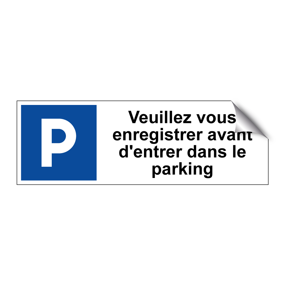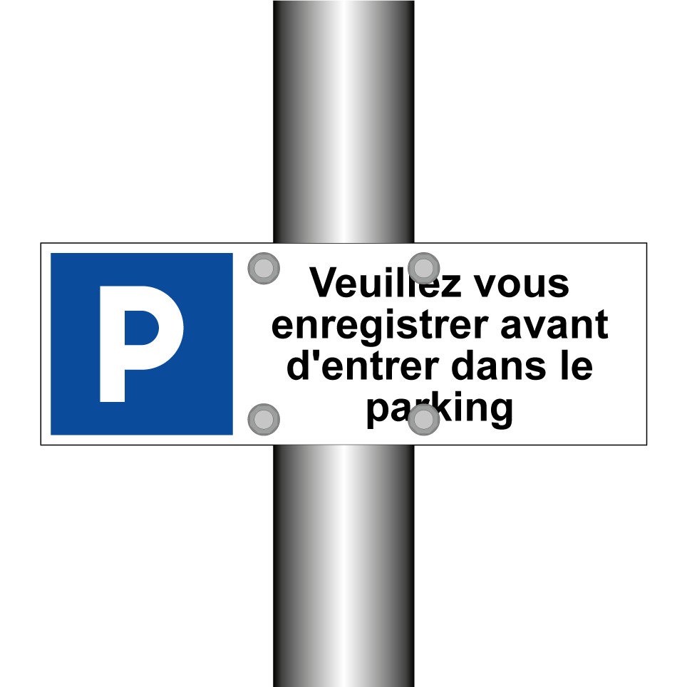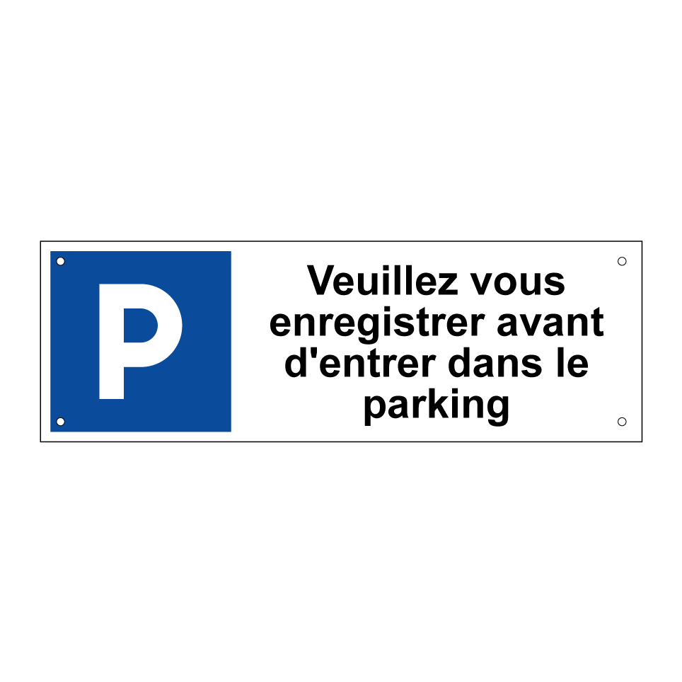 Panneau de stationnement avec le texte : "Veuillez vous enregistrer avant d'entrer dans le parking" et une symbolique claire.