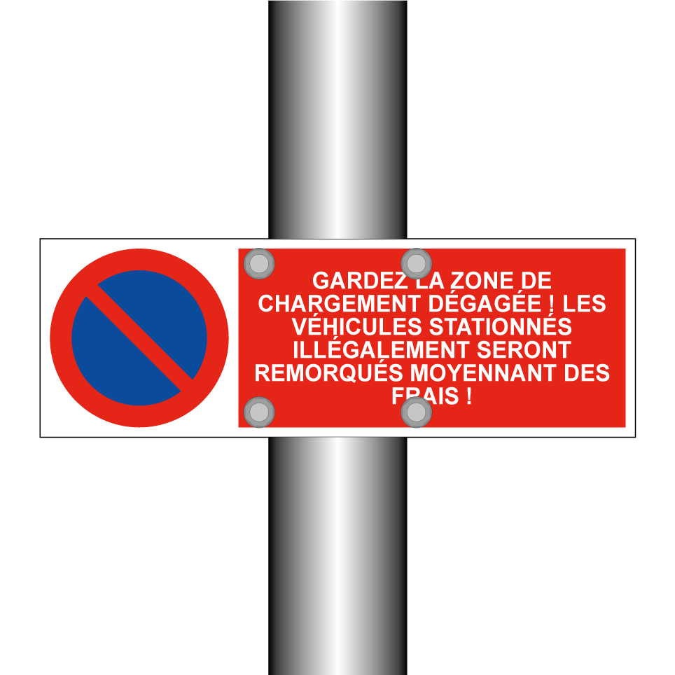 Panneau d'interdiction de stationner avec le texte : "Gardez la zone de chargement dégagée ! Les véhicules stationnés illégalement seront remorqués moyennant des frais !" et une symbolique claire.