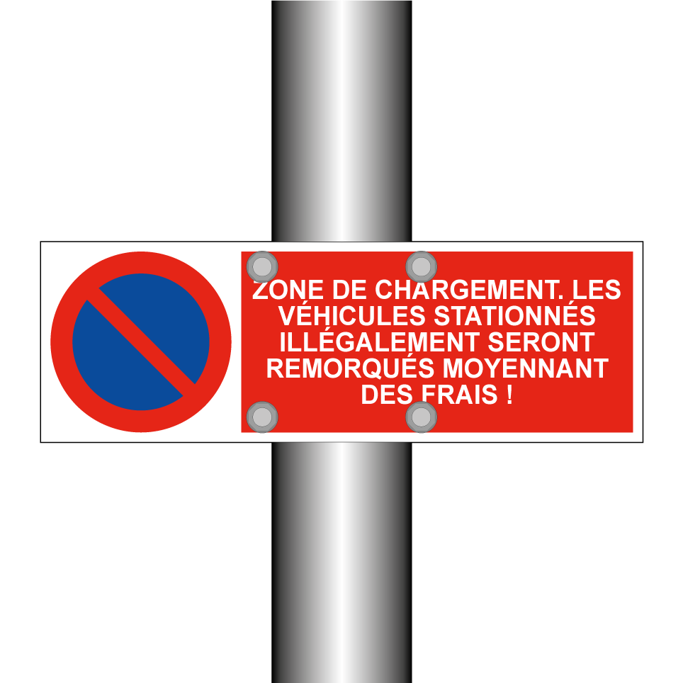 Panneau d'interdiction de stationner avec le texte : "Zone de chargement. Les véhicules stationnés illégalement seront remorqués moyennant des frais !" et une symbolique claire.