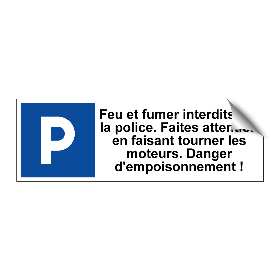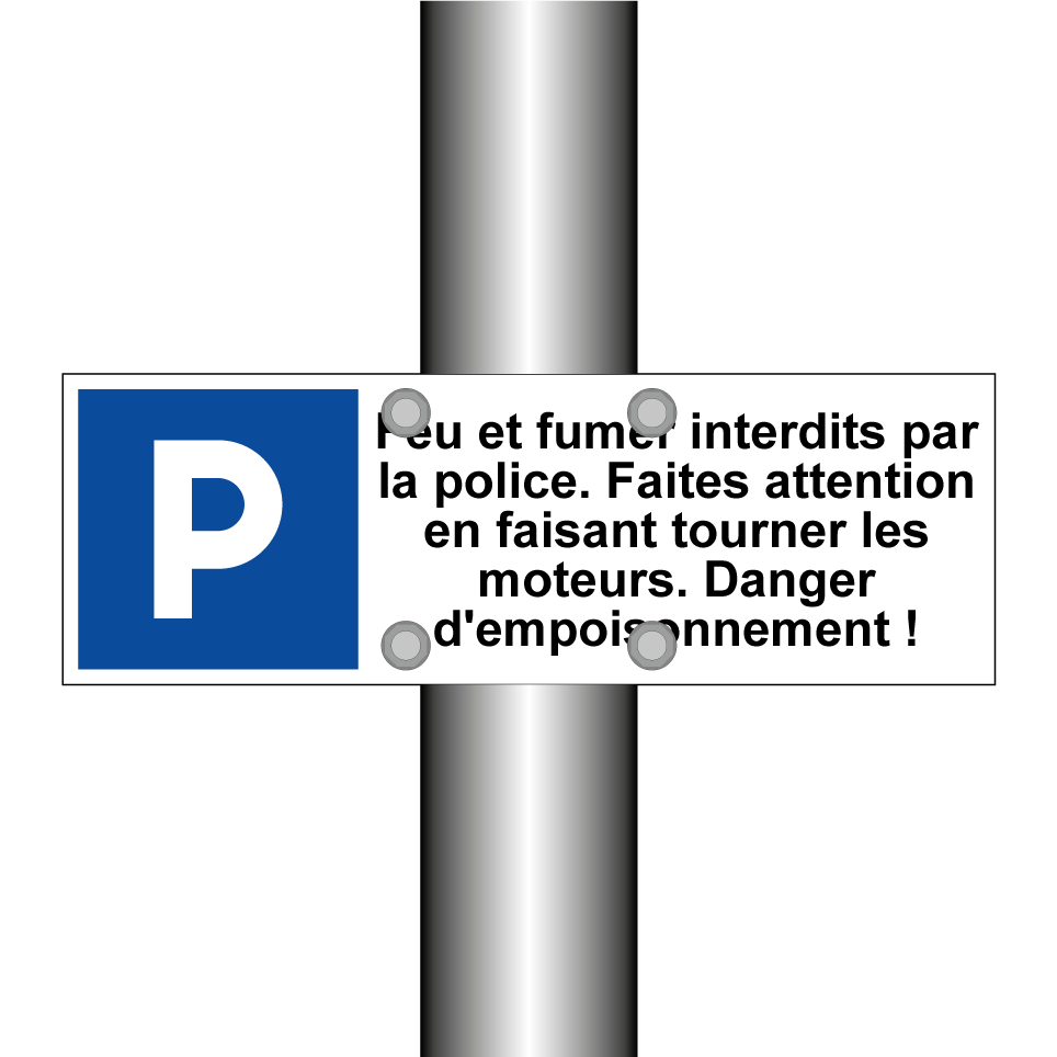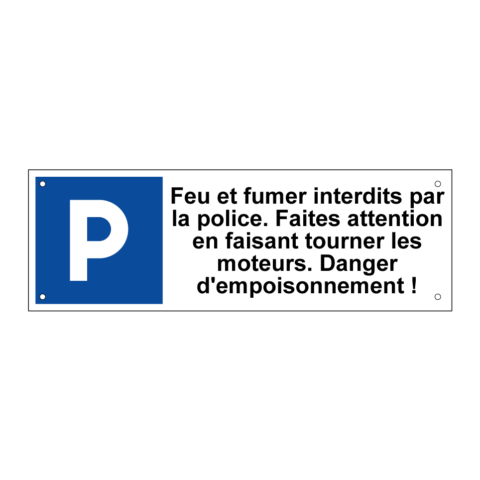 Panneau de stationnement avec le texte : "Feu et fumer interdits par la police. Faites attention en faisant tourner les moteurs. Danger d'empoisonnement !" et une symbolique claire.