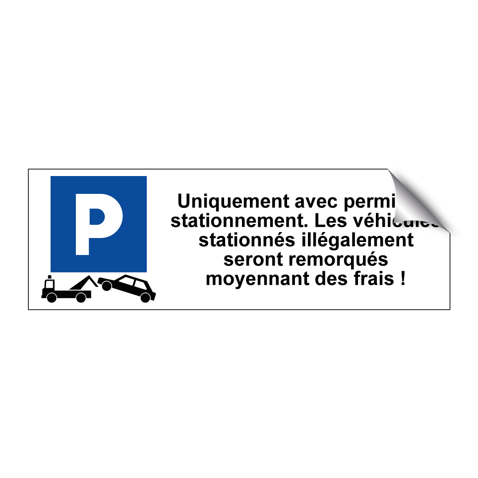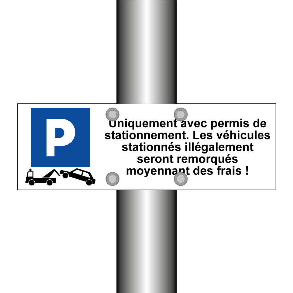Panneau de stationnement avec le texte : "Uniquement avec permis de stationnement. Les véhicules stationnés illégalement seront remorqués moyennant des frais !" et une symbolique claire.