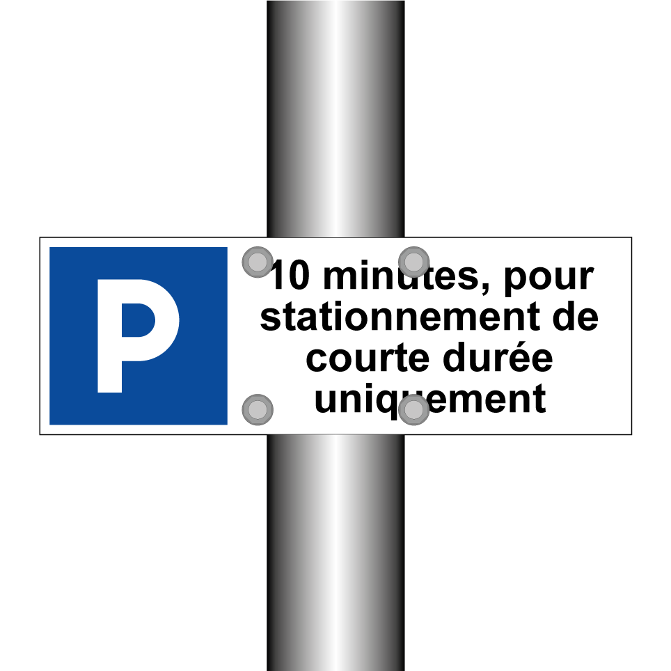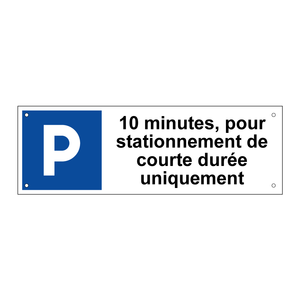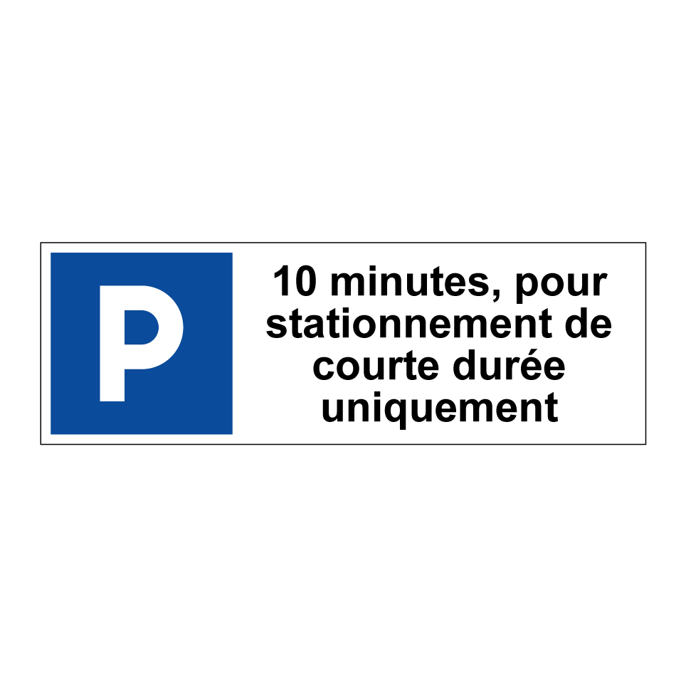 Panneau de stationnement avec le texte : "10 minutes, pour stationnement de courte durée uniquement" et une symbolique claire.