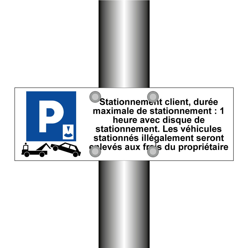 Panneau de stationnement avec le texte : "Stationnement client, durée maximale de stationnement : 1 heure avec disque de stationnement. Les véhicules stationnés illégalement seront enlevés aux frais du propriétaire" et une symbolique claire.