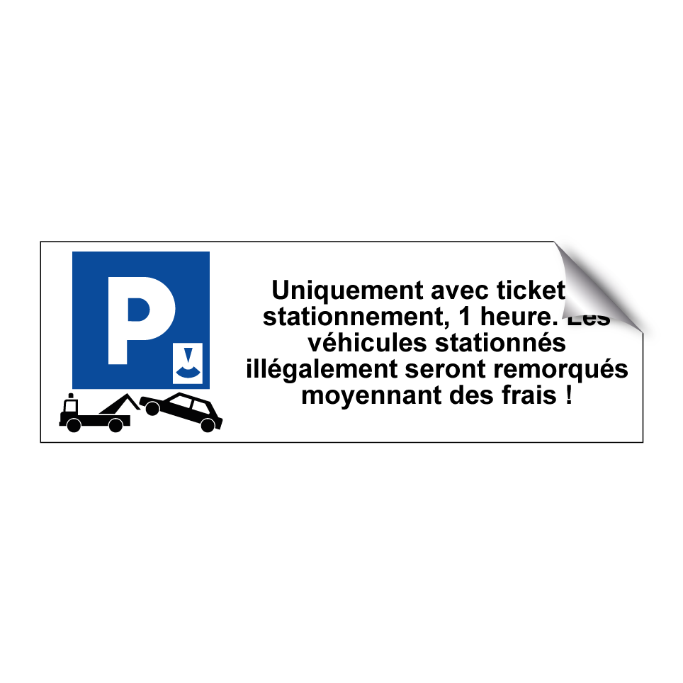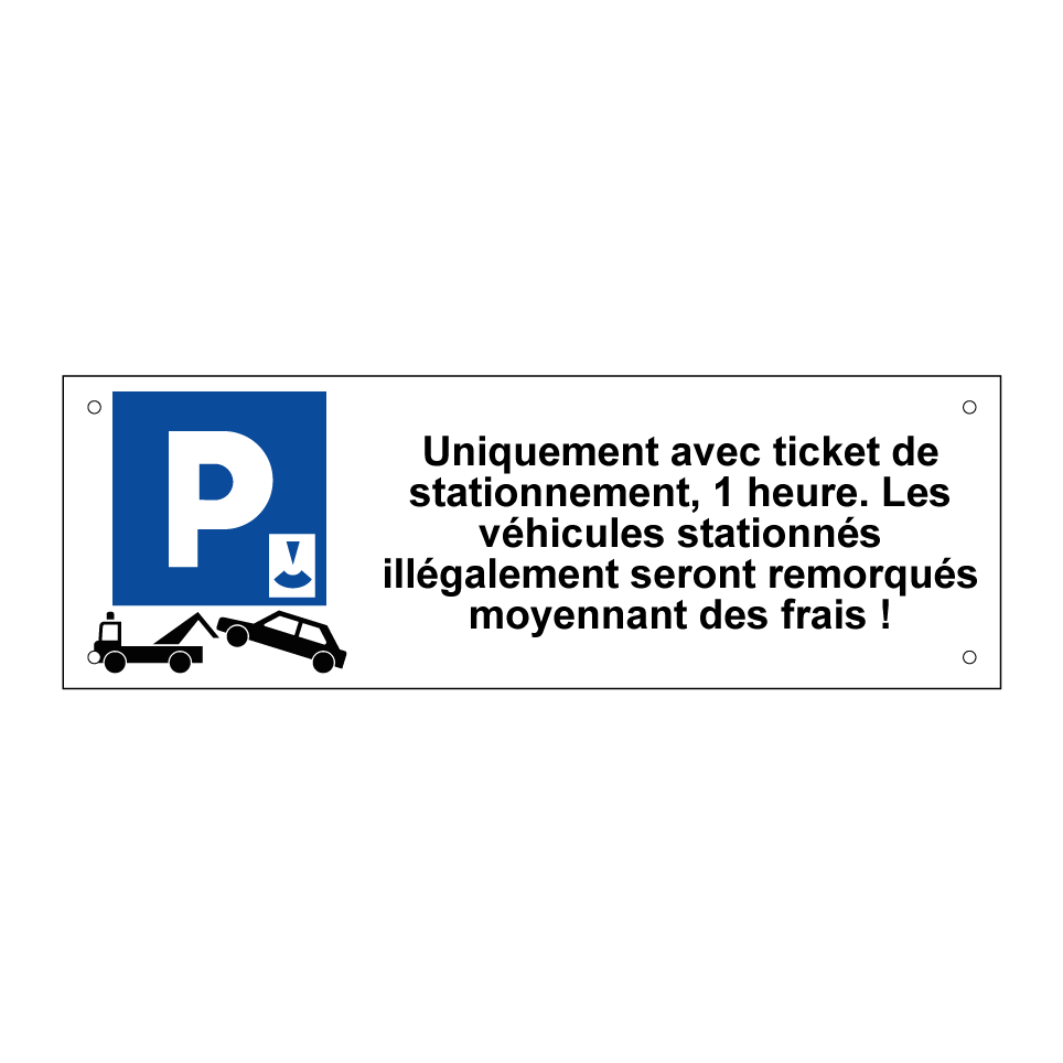 Panneau de stationnement avec le texte : "Uniquement avec ticket de stationnement, 1 heure. Les véhicules stationnés illégalement seront remorqués moyennant des frais !" et une symbolique claire.
