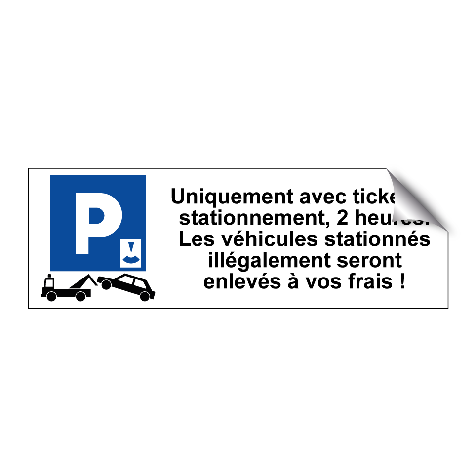 Panneau de stationnement avec le texte : "Uniquement avec ticket de stationnement, 2 heures. Les véhicules stationnés illégalement seront enlevés à vos frais !" et une symbolique claire.